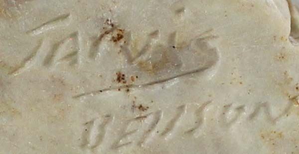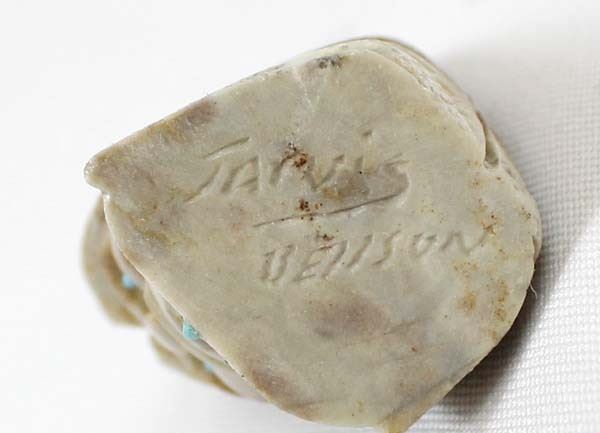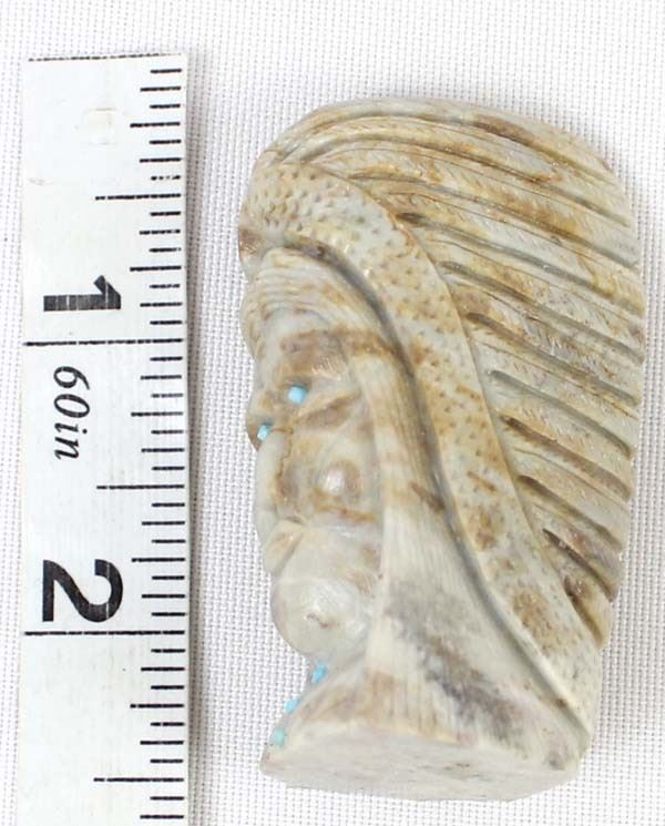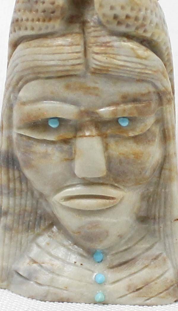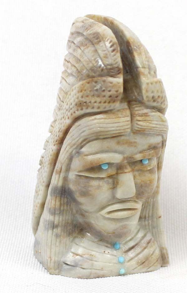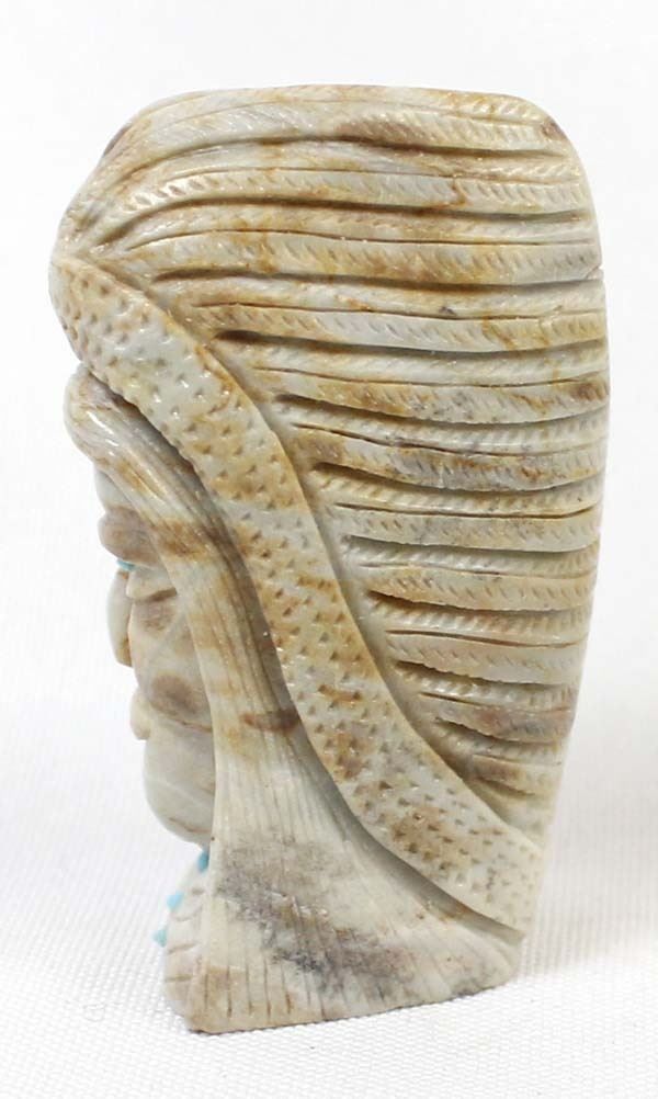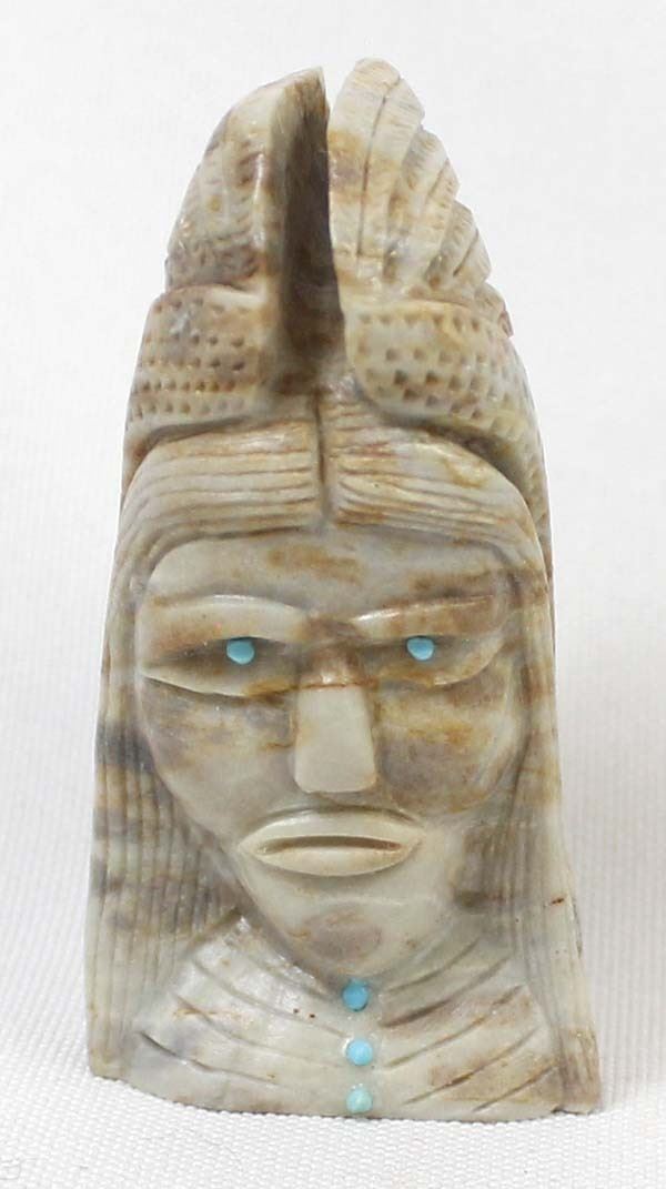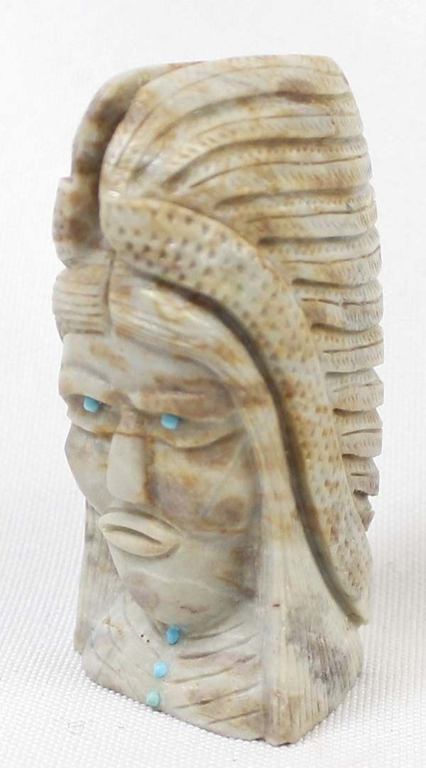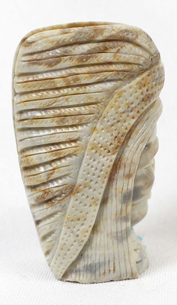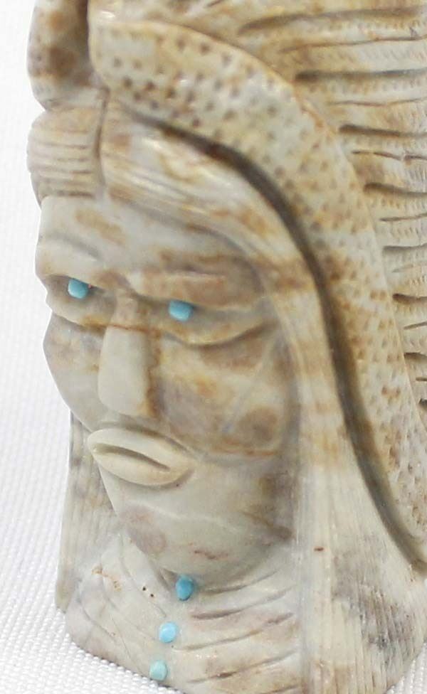 Native American Zuni Picasso Marble Chief Bust Fetish by Jarvis Bellson (deceased artist), measures 1'' x 2.5'' x 1.25'' and is signed on the bottom, turquoise eyes and necklace