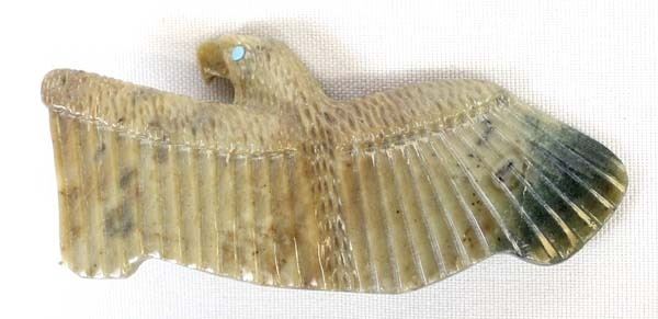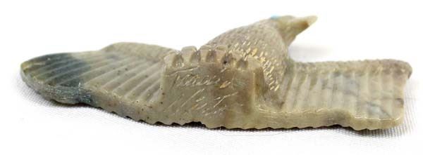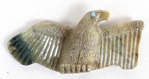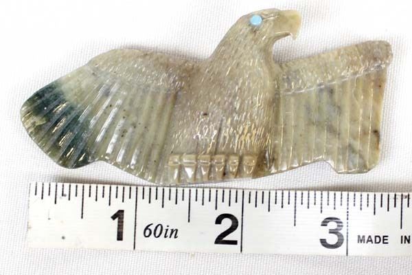 Native American Zuni Picasso Marble Eagle Fetish by Travis Nieto, measures 3.5'' x 1.75'' and is signed on the bottom, turquoise eyes