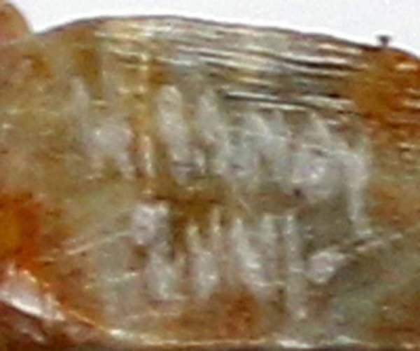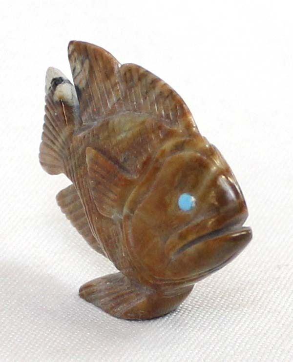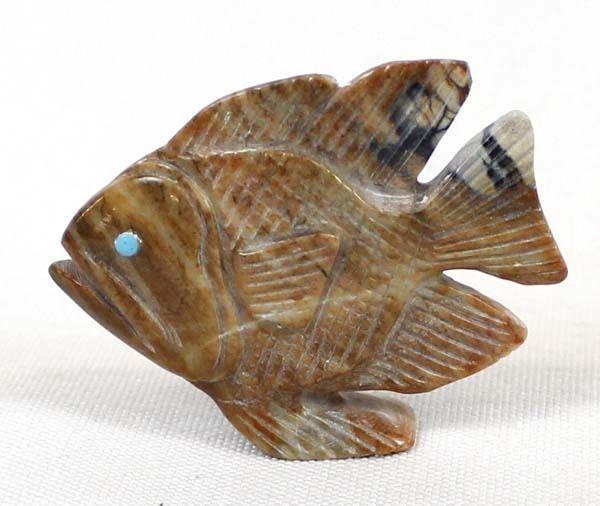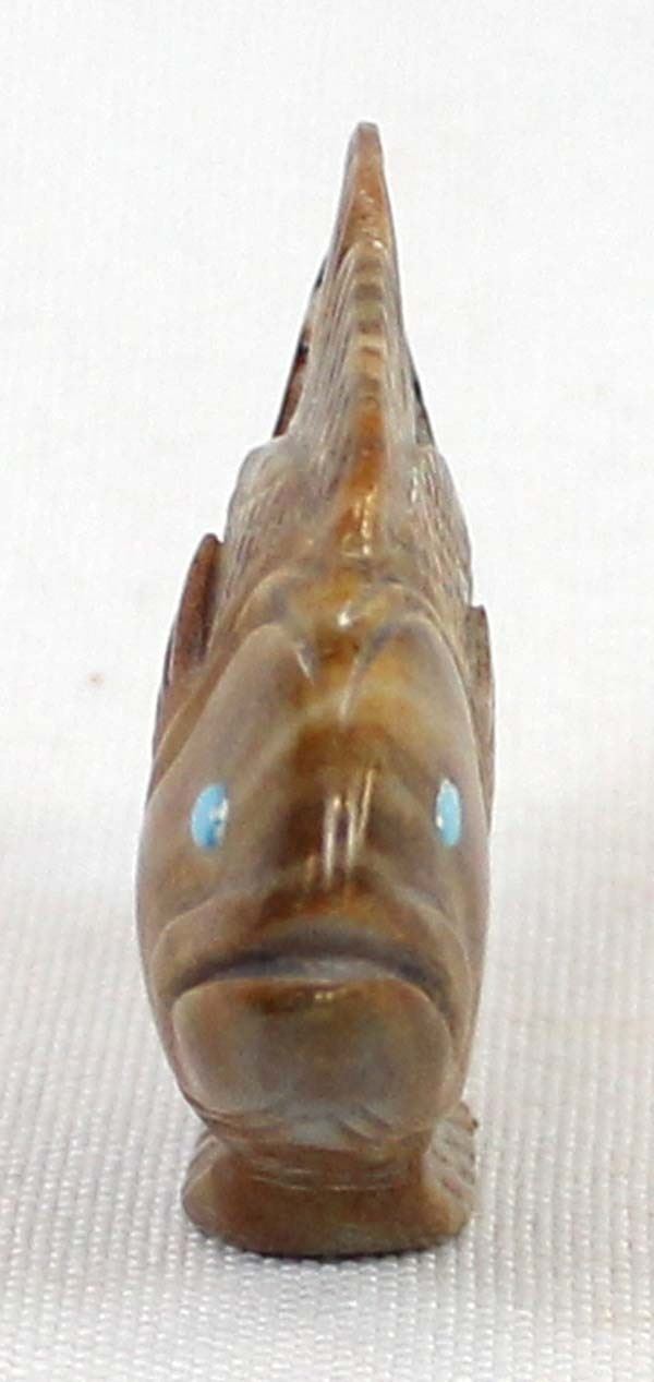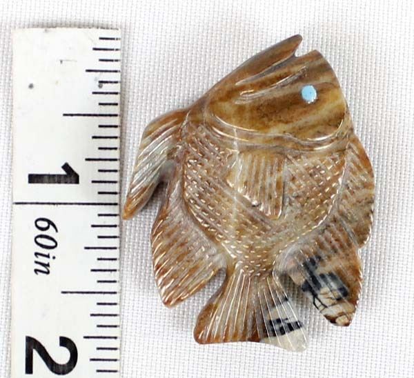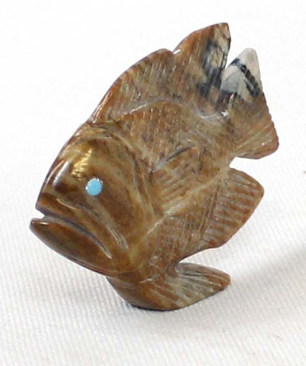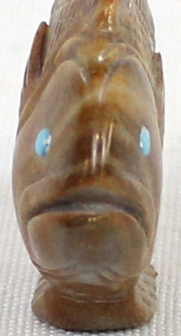 Native American Zuni Picasso Marble Fish Fetish by Hudson Sandy, measures 1.75'' x 1.5'' and is signed on the bottom, turquoise eyes