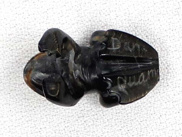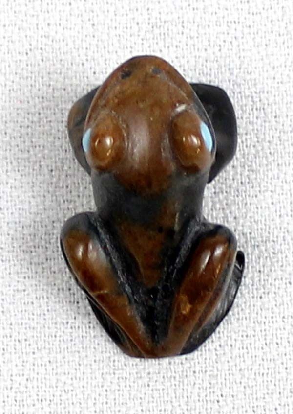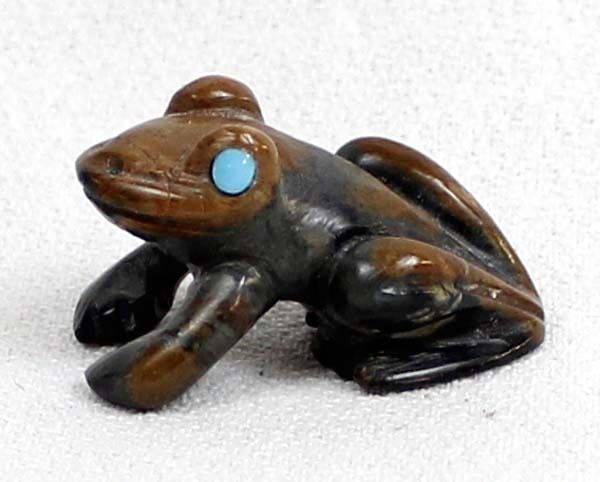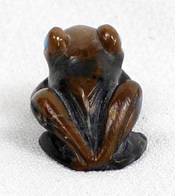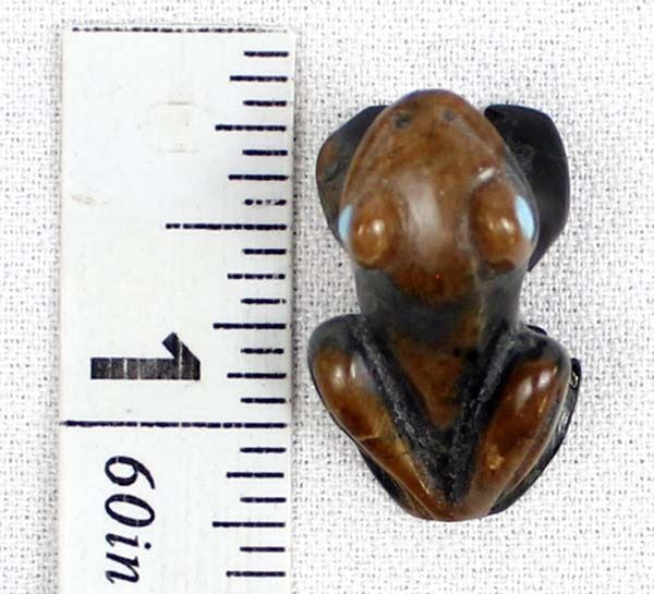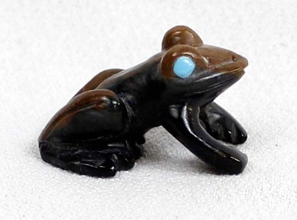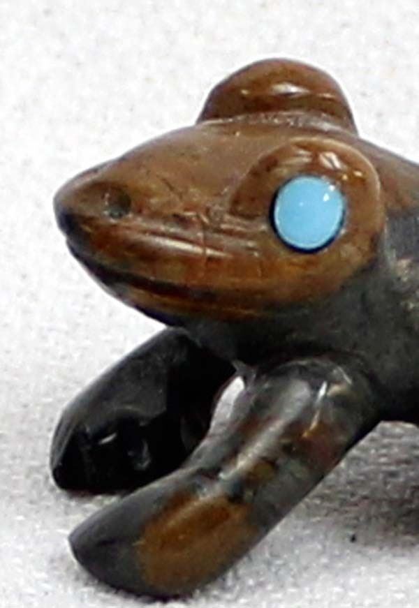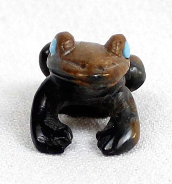 Native American Zuni Picasso Marble Frog Fetish by Dan Quam, measures 1''L x .5''H x .5''W and is signed on the bottom, turquoise eyes