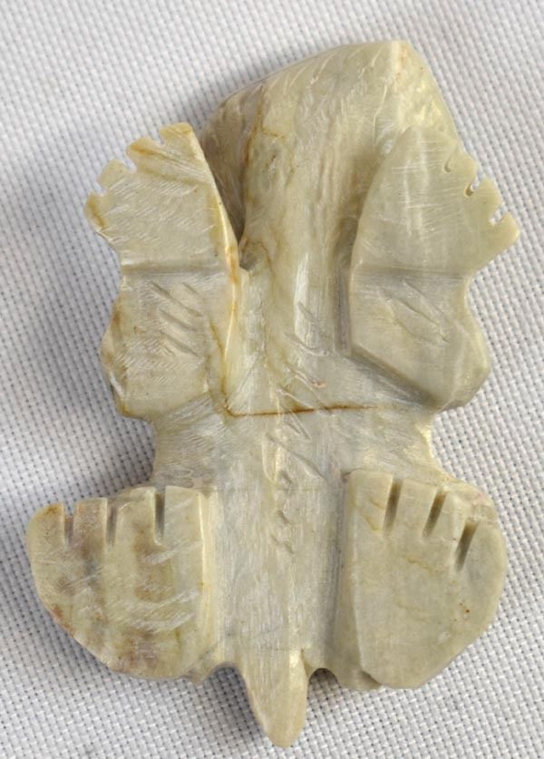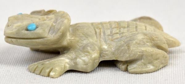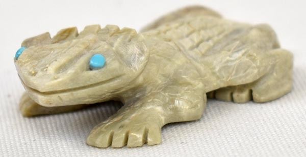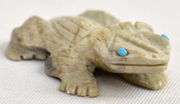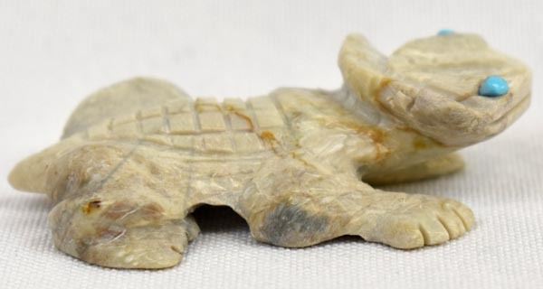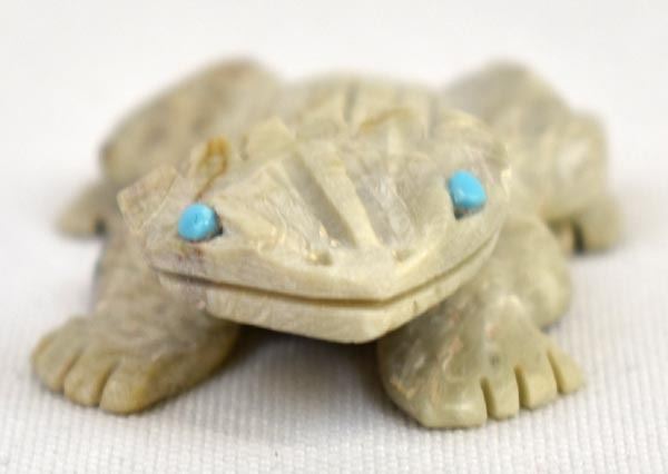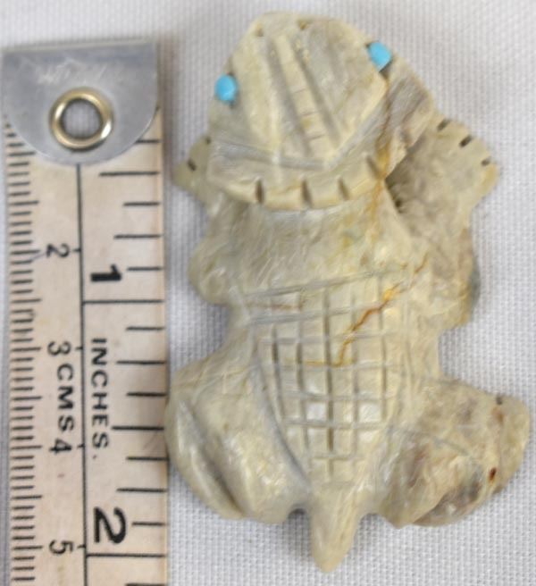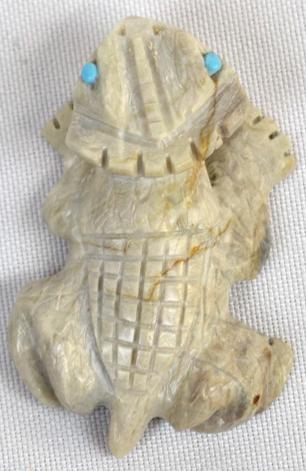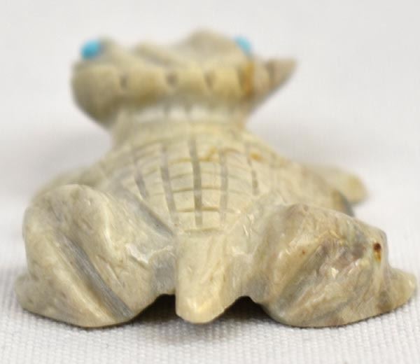 Native American Zuni Picasso Marble Horned Toad Fetish by Dane Malani, measures 2'' x 1.25'' and is signed on the bottom, turquoise eyes