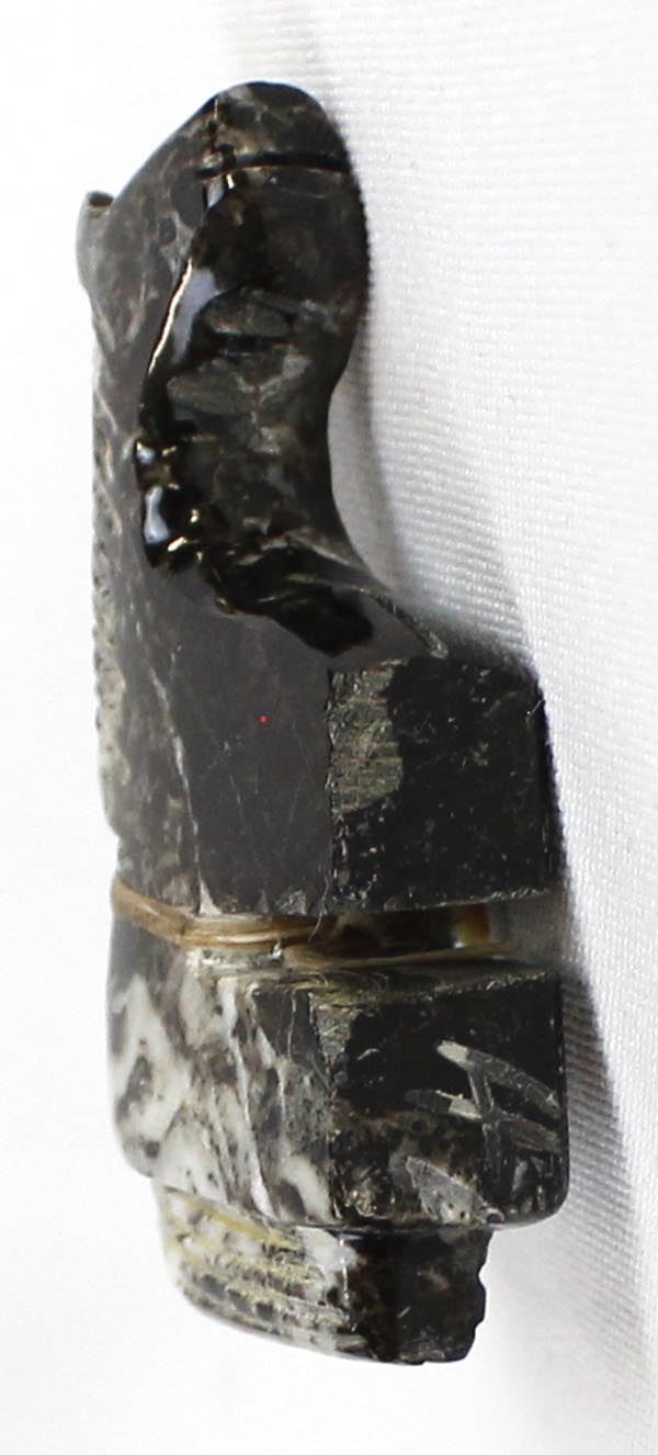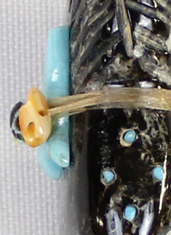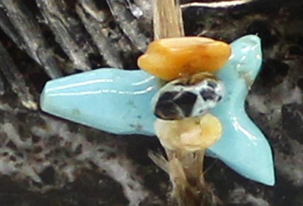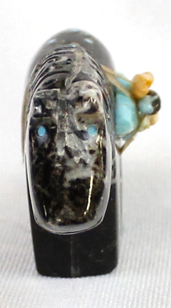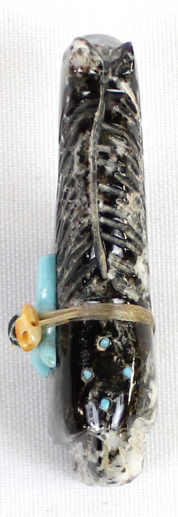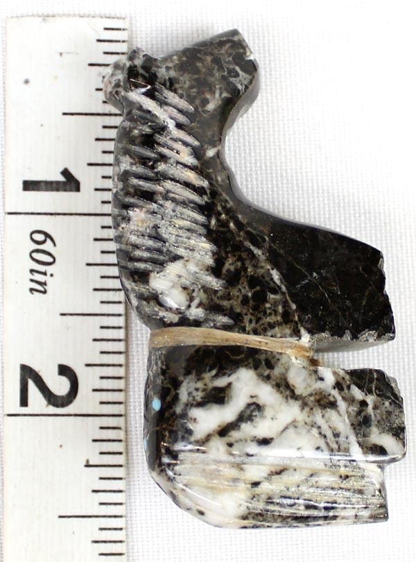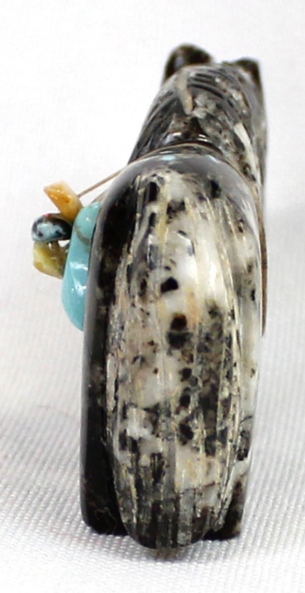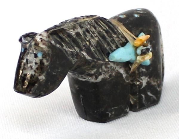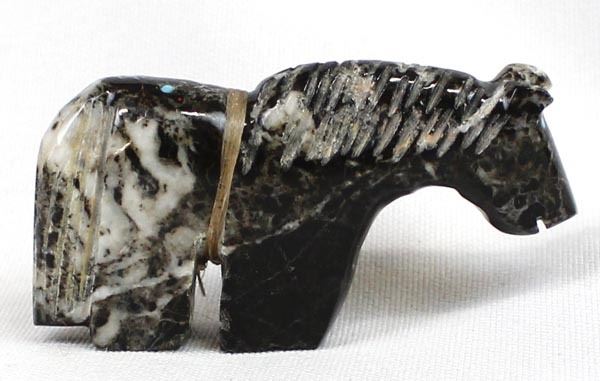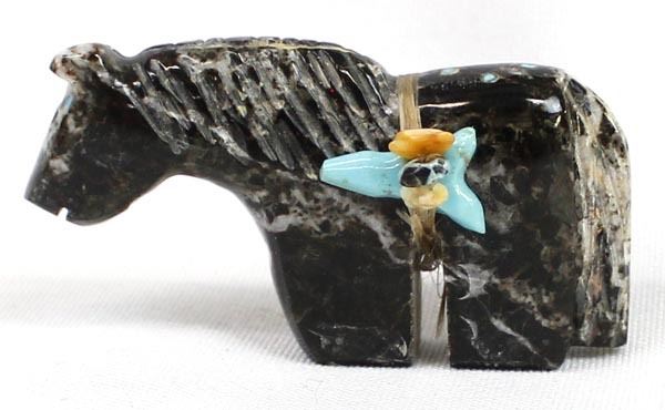 Native American Zuni Picasso Marble Horse Fetish by Al Lasiloo, measures 2.5'' x 1.5'' x .5'' and has artist's initials on the bottom, carved turquoise arrowhead spirit bundle embellished with shell and turquoise beads