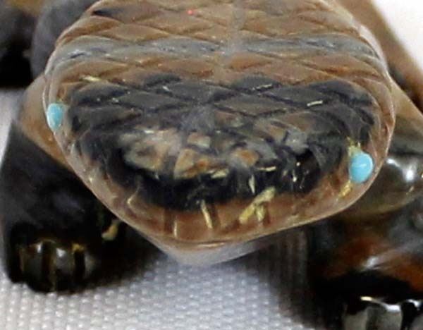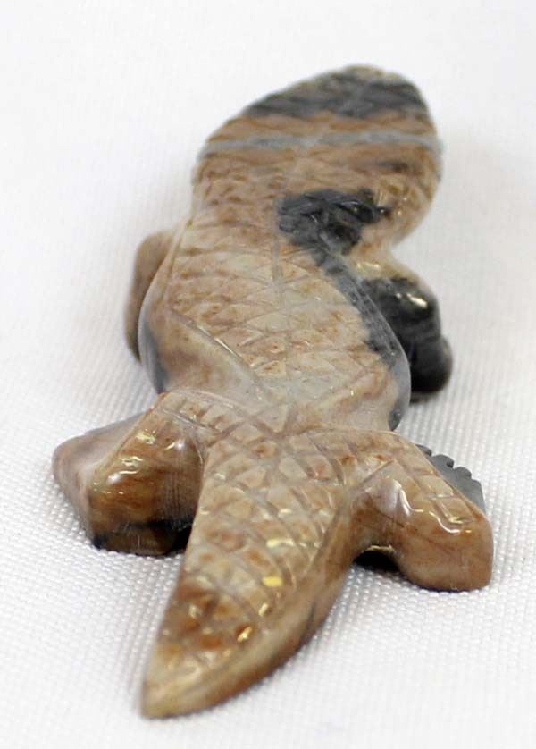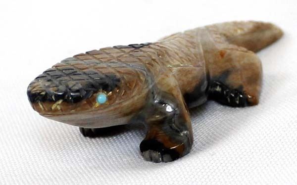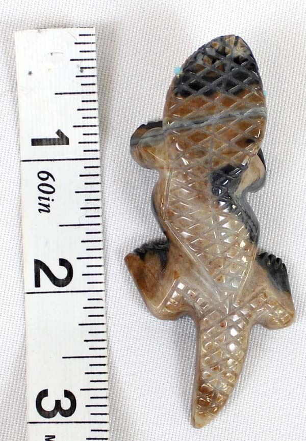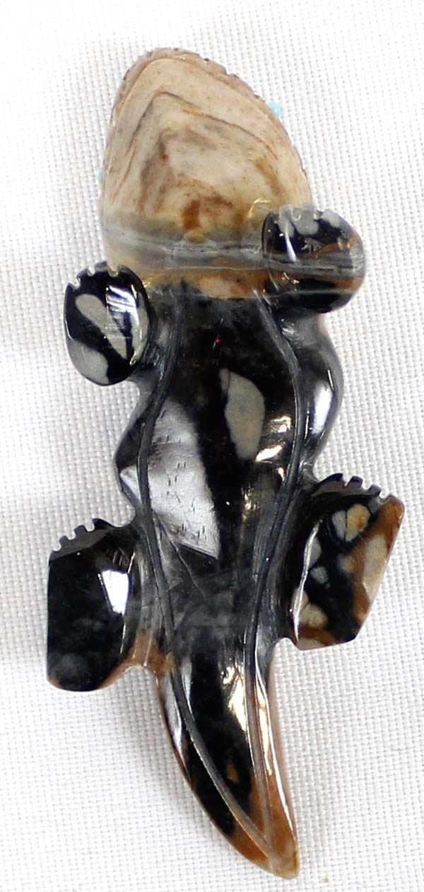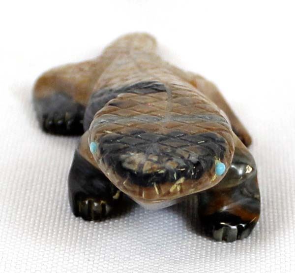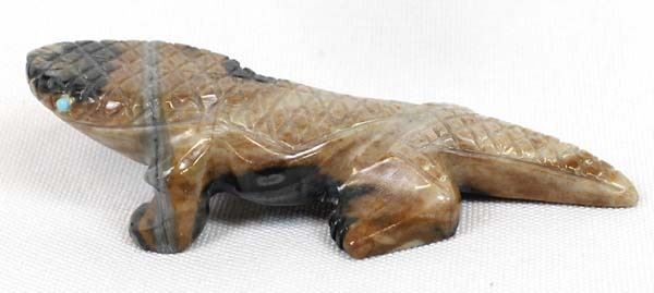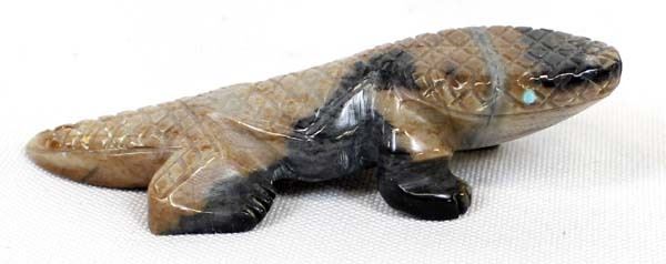 Native American Zuni Picasso Marble Lizard Fetish, measures 3''L x 5/8''H x 1.5''W, unsigned, turquoise eyes, nice detail on the scales, possible artist Alvin Haloo