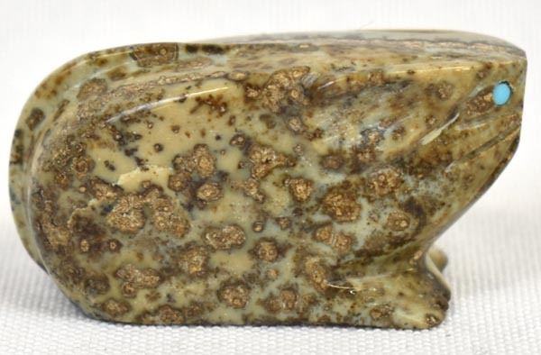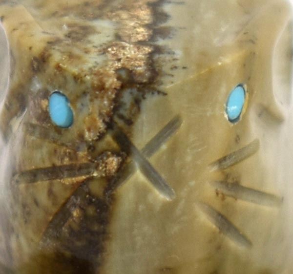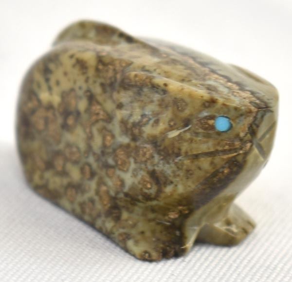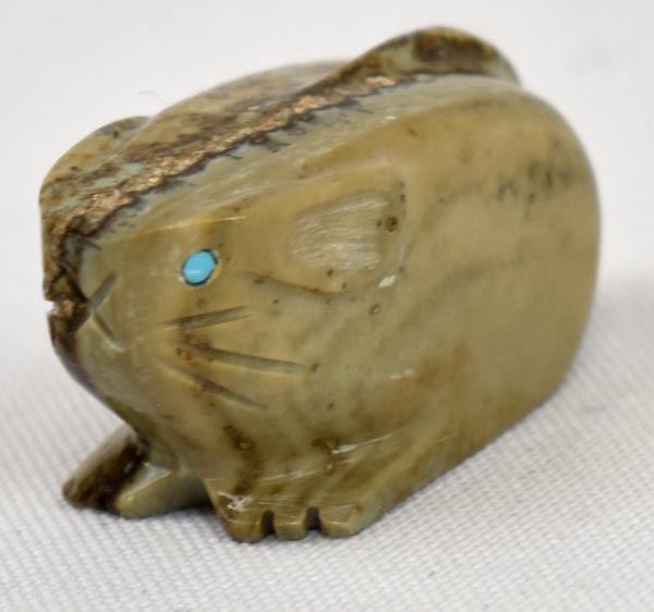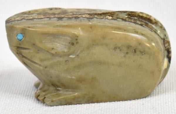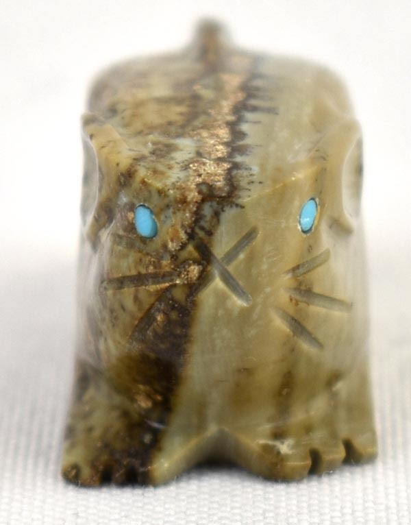 Native American Zuni Picasso Marble Mouse Fetish by Tony Mackel, measures 1.5'' x 1'' x .75'' and is signed on the bottom, turquoise eyes