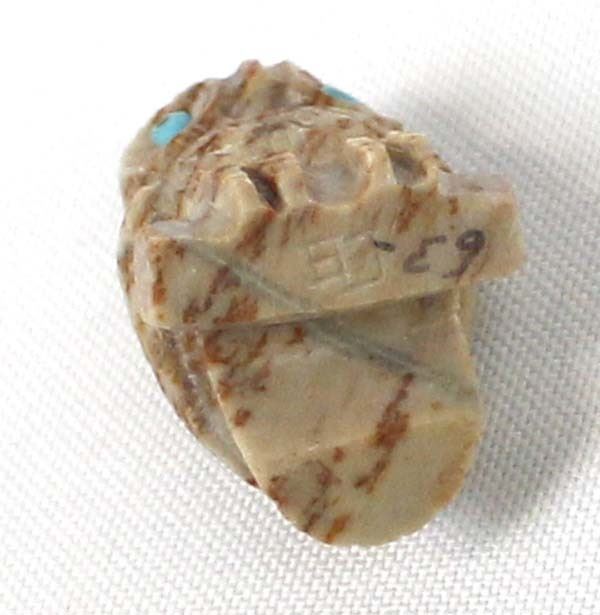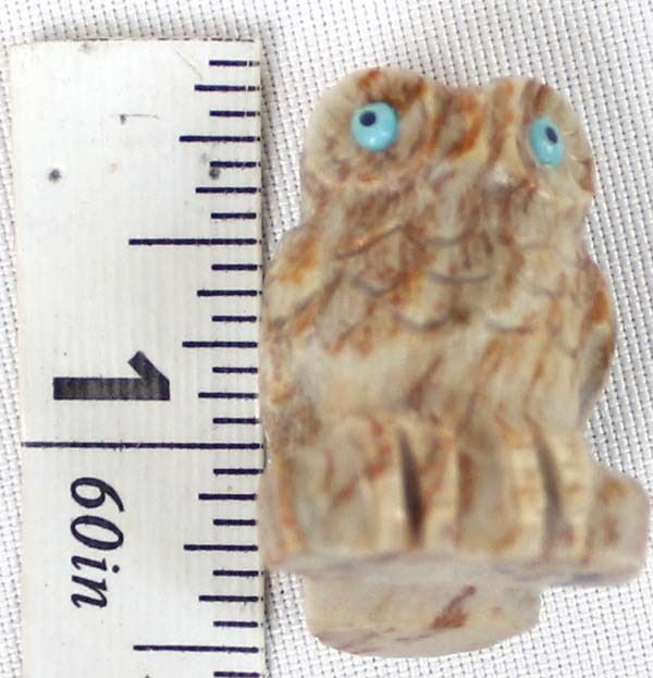 Native American Zuni Picasso Marble Owl Fetish by Christine Banteah, measures 1'' x .75'' x .75'', turquoise eyes and has artist's initials on the bottom