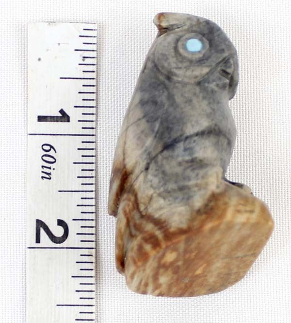 Native American Zuni Picasso Marble Owl Fetish by Michael Coble Sr., measures 2'' x 1.5'' x 1.25'' and is signed on the bottom, turquoise eyes
