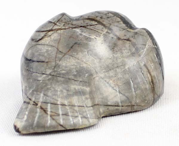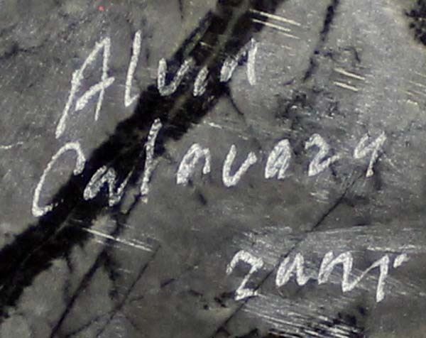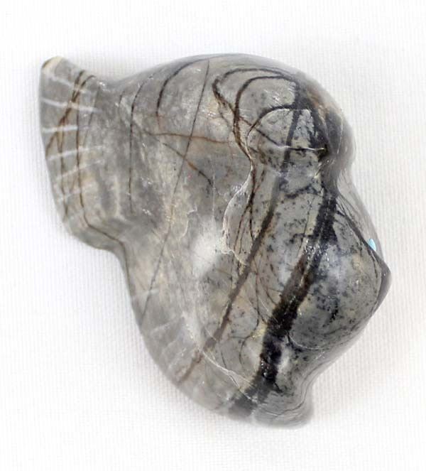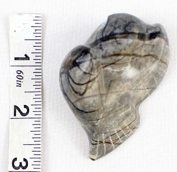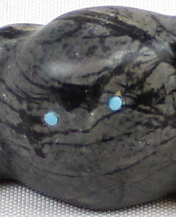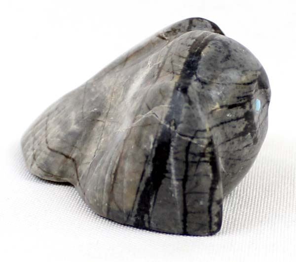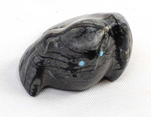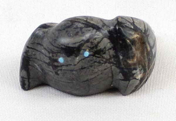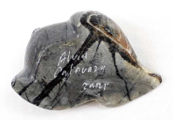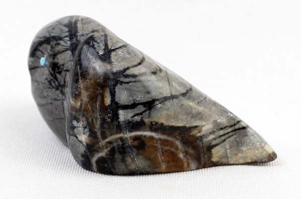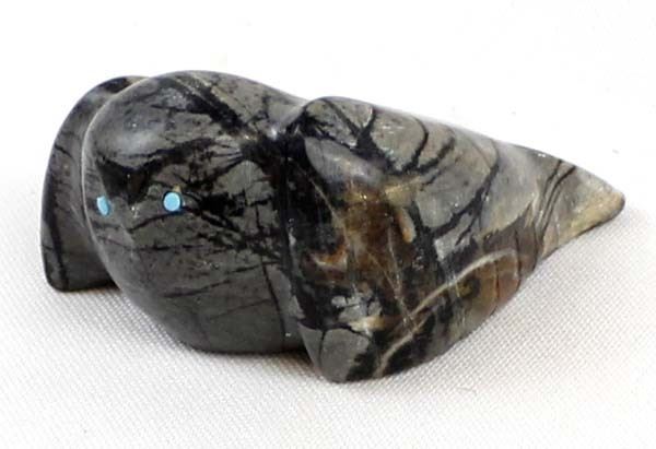 Native American Zuni Picasso Marble Owl Fetish by Alvin Calavaza, measures 3'' x 1.5'' x 1.5'' and is signed on the bottom, turquoise eyes