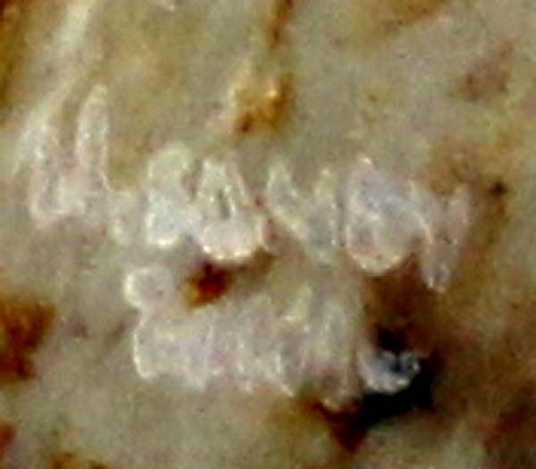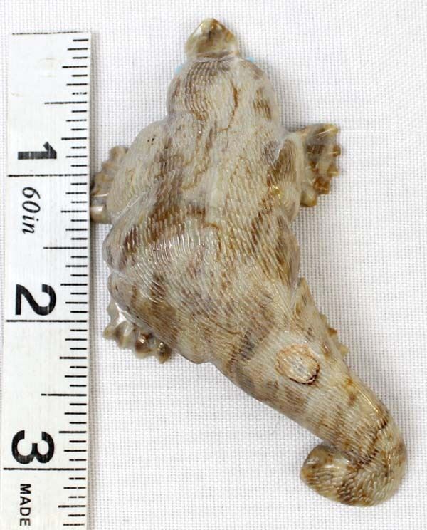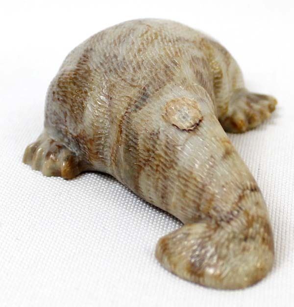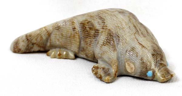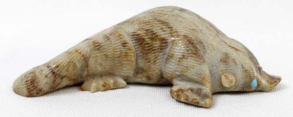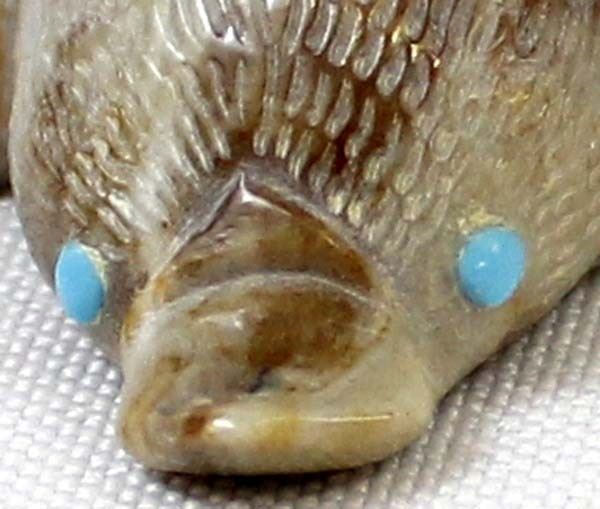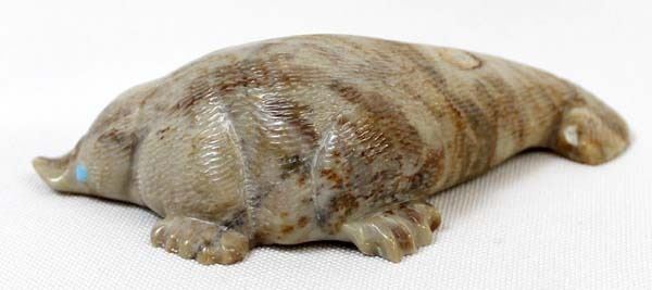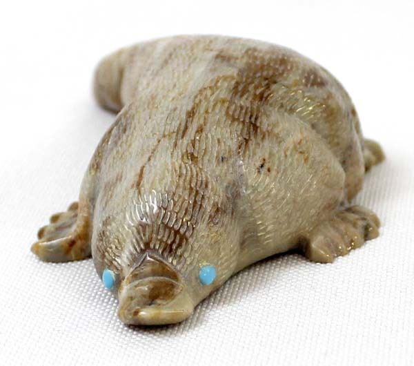 Native American Zuni Picasso Marble Platypus Fetish by Hudson Sandy, measures 1.5'' x 3.5'' x 1'' and is signed on the bottom, turquoise eyes