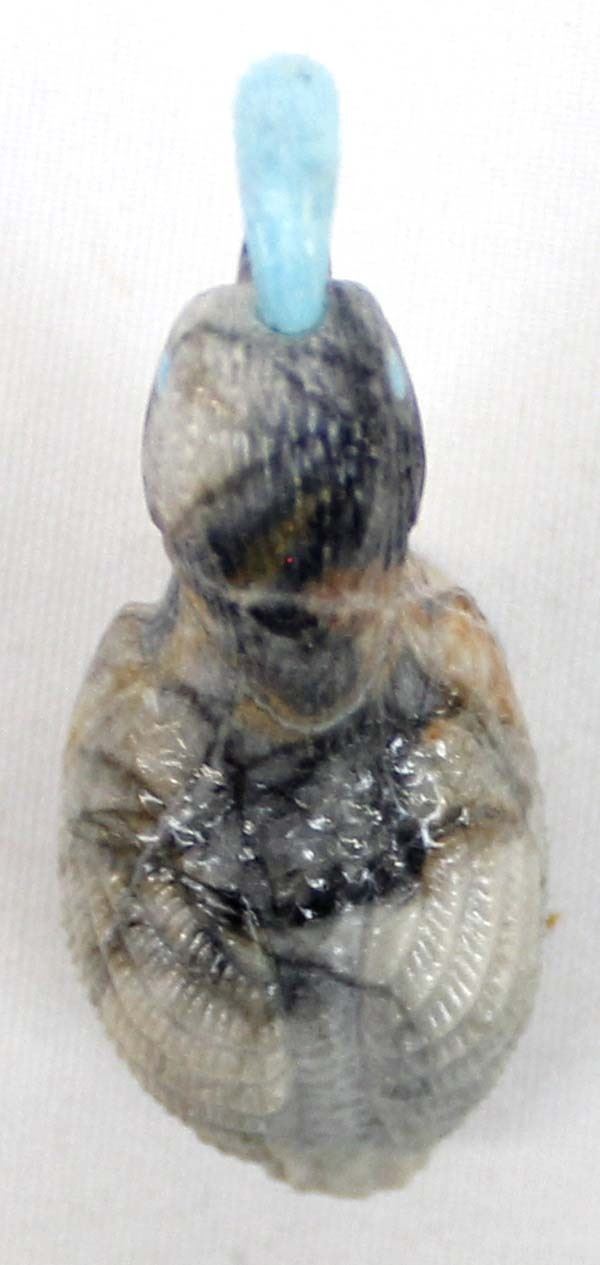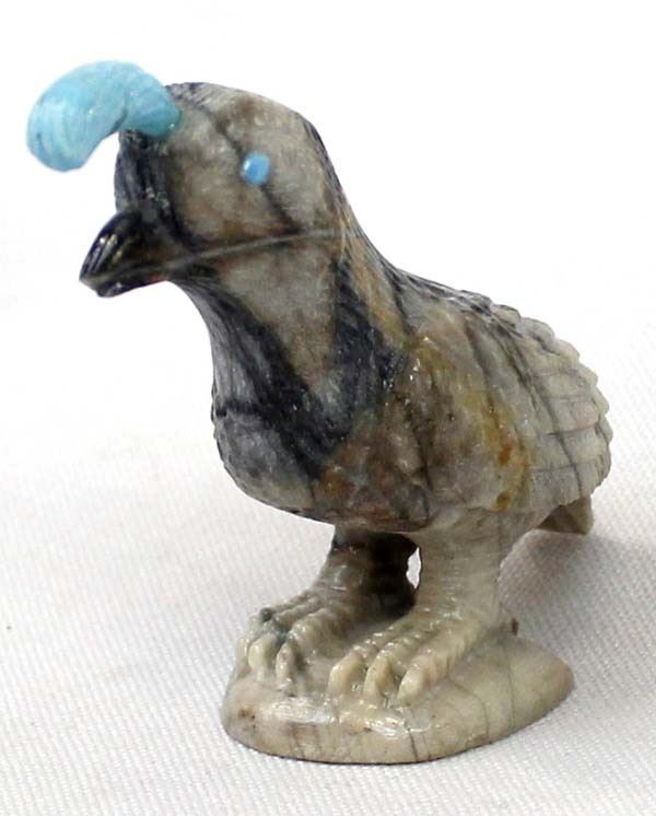 Native American Zuni Picasso Marble Quail Fetish, measures 2.5''L x 1''W x 2.25''H and has artist's initials on the bottom, turquoise eyes and feather, fabulous detail, possible artist Hopi Carver Milton Honawa