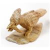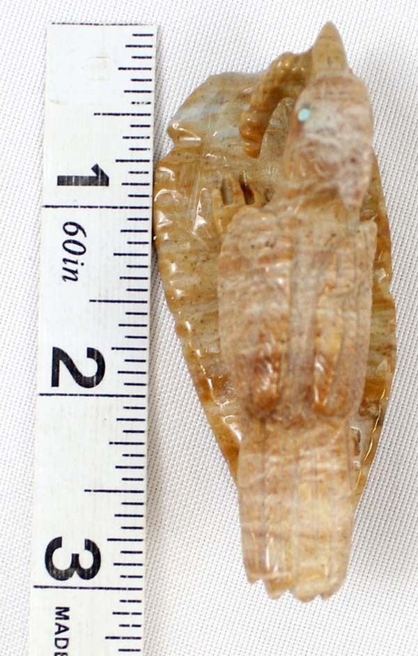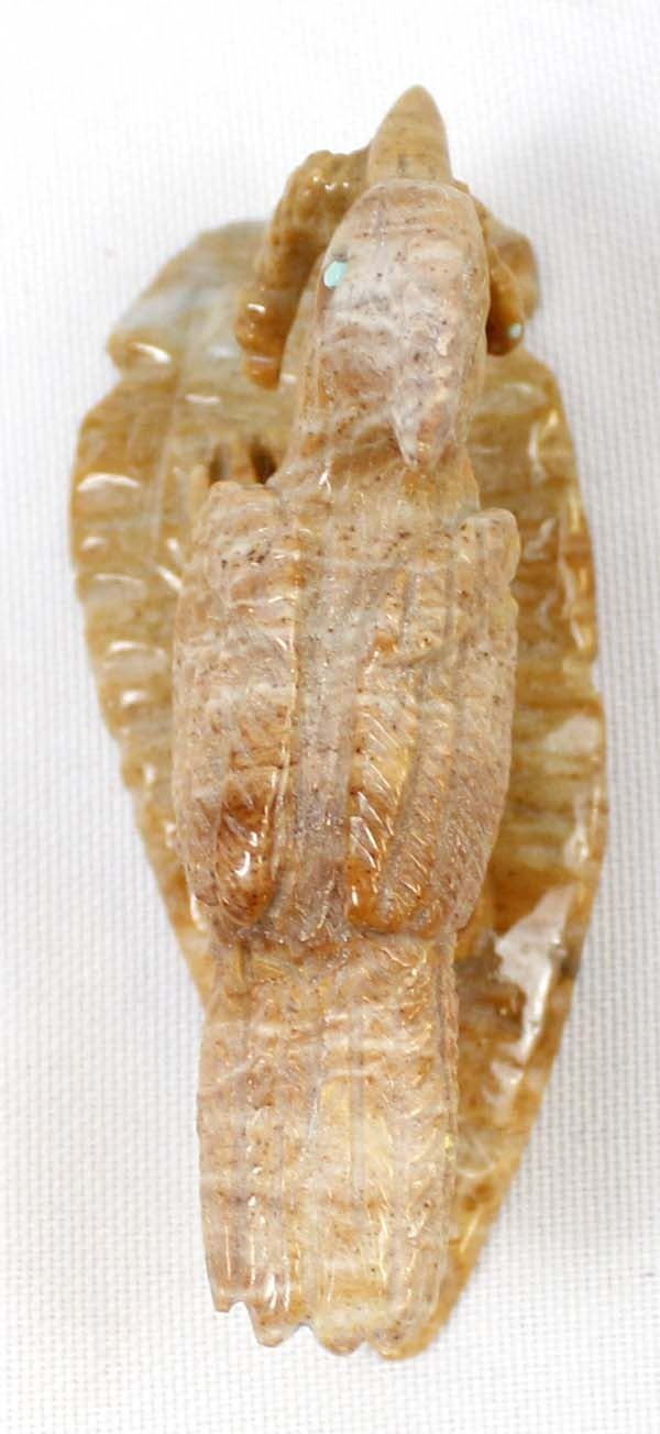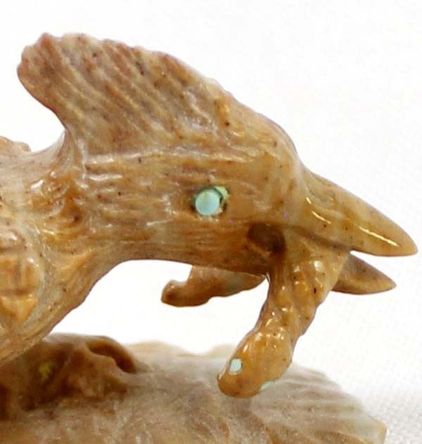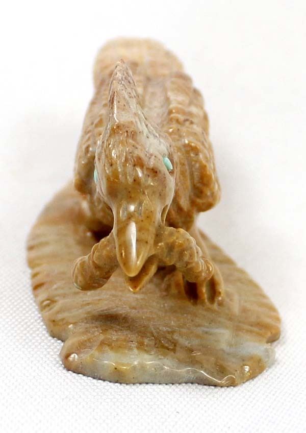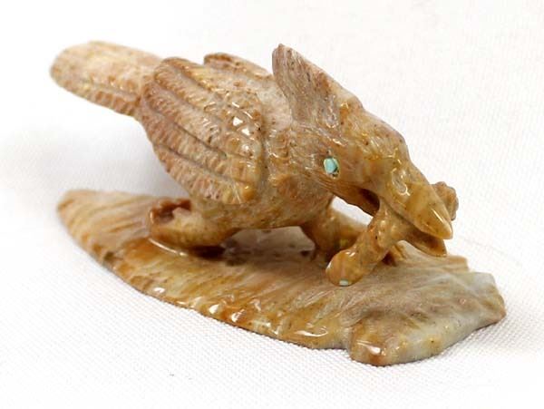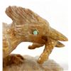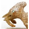 Native American Zuni Picasso Marble Roadrunner Fetish by Michael Sanchez, measures 1'' x 1'' x 2.75'' and is signed on the bottom, turquoise eyes, has a snake in its beak with turquoise eyes