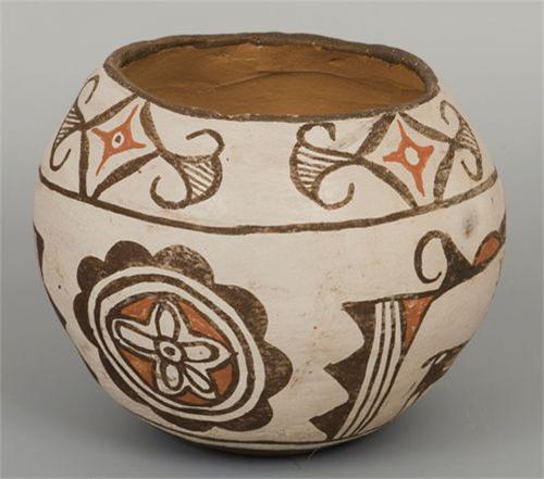 Zuni Pueblo Pottery: Strong, bold designs on a white slip commonly characterize the design elements of Zuni Pueblo pottery, as well as depictions of tadpoles, frogs, heartline deer and dragonflies. Pre-1930s specimens are rare, highly prized and highly publicized when they are offered for sale.