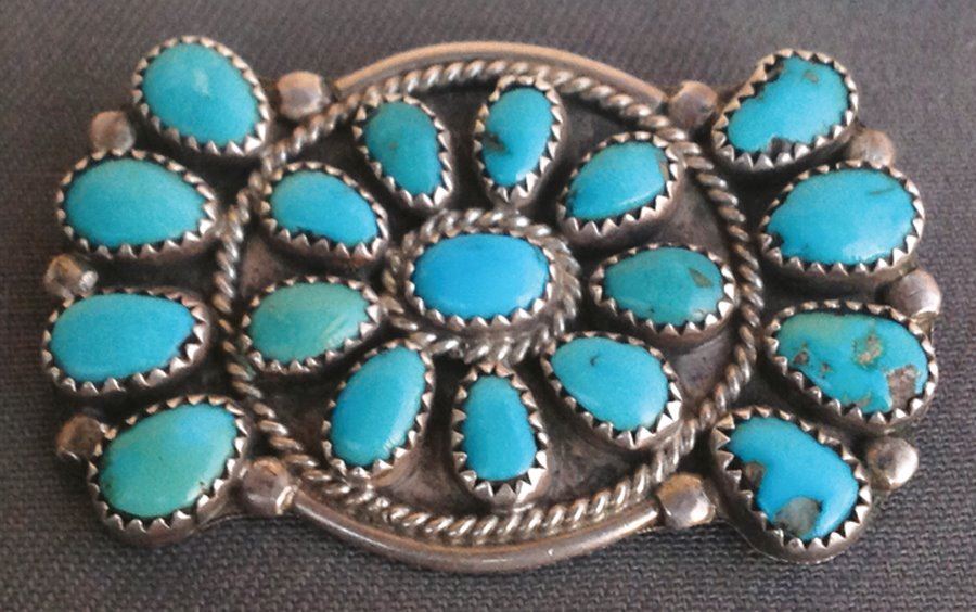 Vintage early style turquoise and silver butterfly blouse/sash pin with 17 hand cut and set round and teardrop stones. Very good condition.,,2" x 1 1/4"