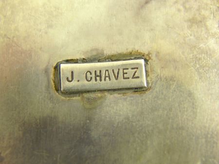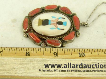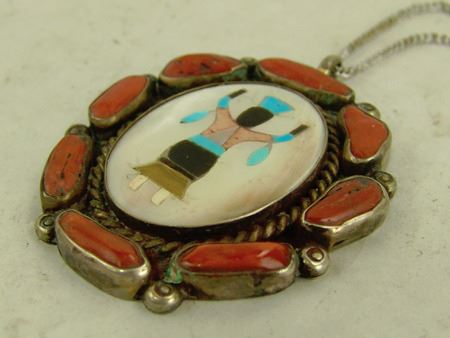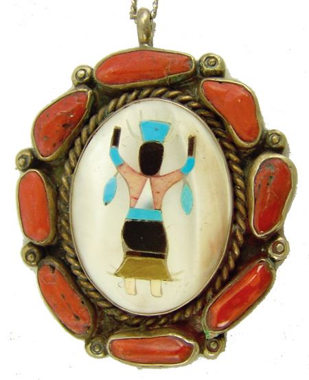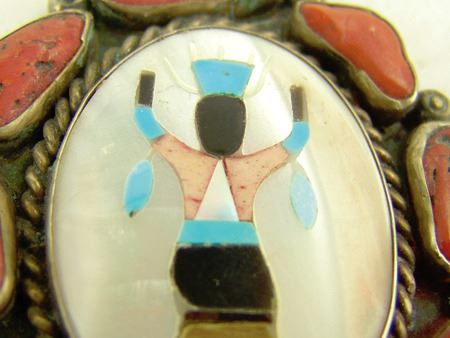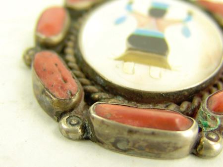 Ca. 1970s, Classic all-silver pendant with mosaic inlay dancer in a shell disc flanked by natural contour coral stones. Very good condition, shows some use. 2-1/2" x 2"