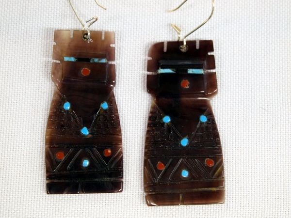 Zuni Pin Shell Corn Maiden Earrings, Robt. Estie. Unique Zuni earrings by Robert Estie, delicately carved corn maiden out of pin shell. Accents are hand-cut turquoise and coral, measures 1 3/4'' x 3/4''. Mocha brown with sterling wires, signed ''E''.