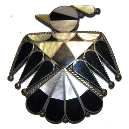 Circa 1960, Excellent Zuni "Thunderbird" pin of jet and shell channel work. 2-3/4" x 2-5/8"