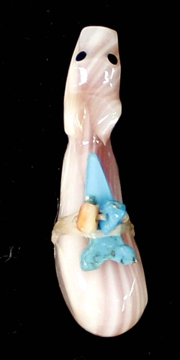 Native American Zuni Pink Mother of Pearl Bear Fetish, measures 1.25'' x .5'' x .25'', turquoise arrowhead and red shell bead spirit bundle