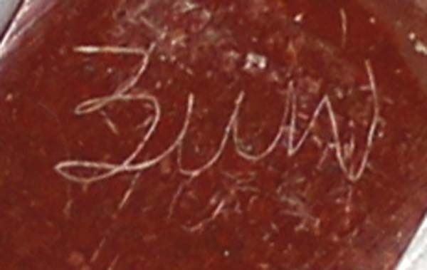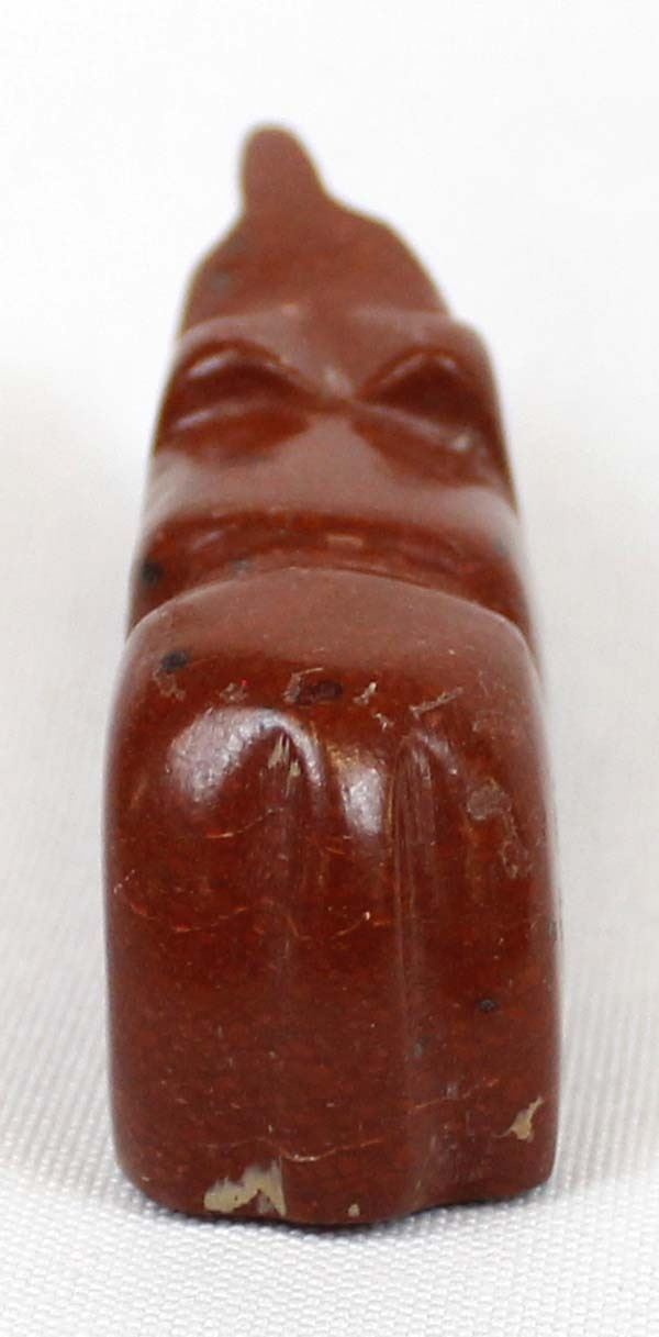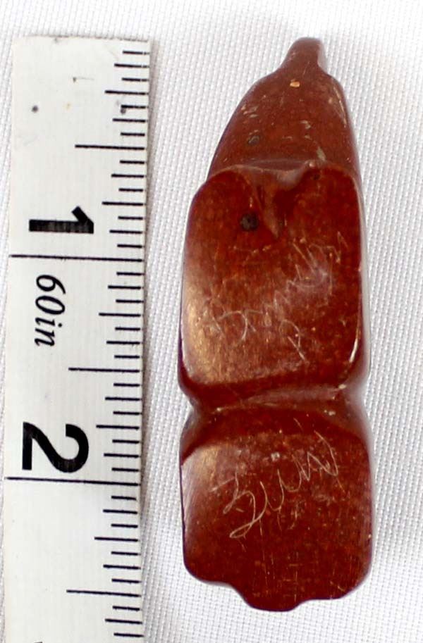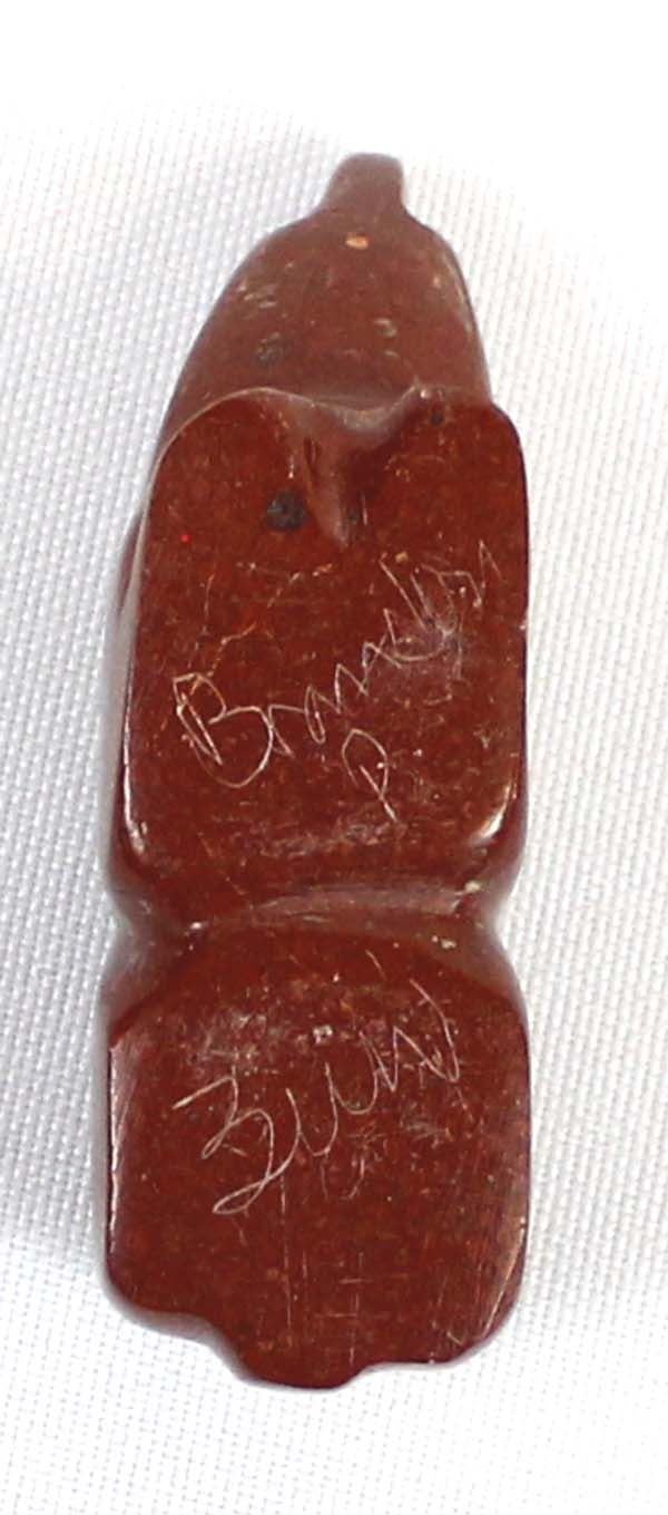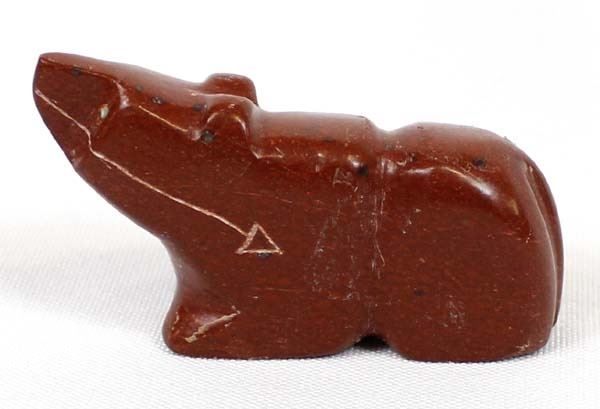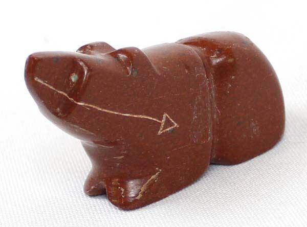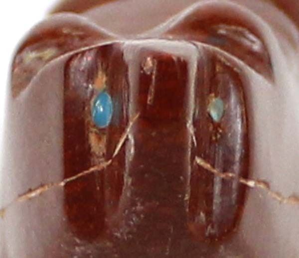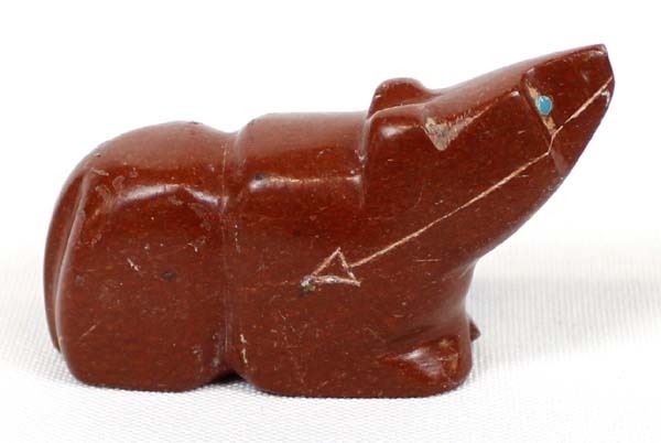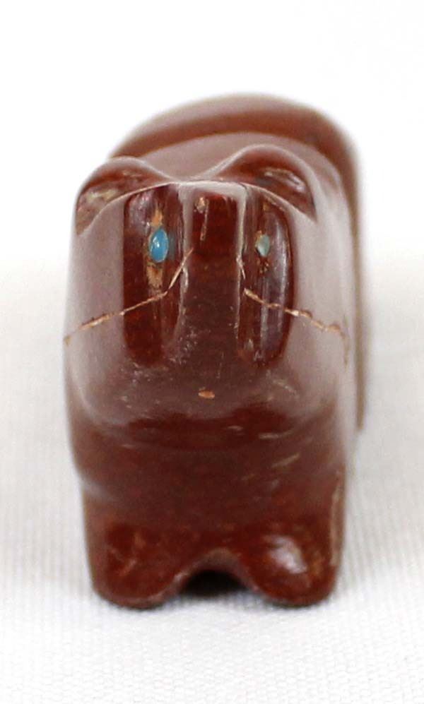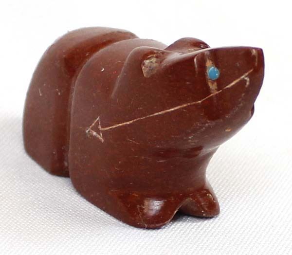 Native American Zuni Pipestone Bear Fetish by Brandon Phillips, measures 2.75'' x 1.75'' x 1'' and is signed on the bottom, turquoise eyes and etched heartline