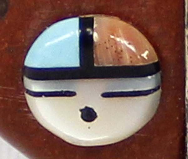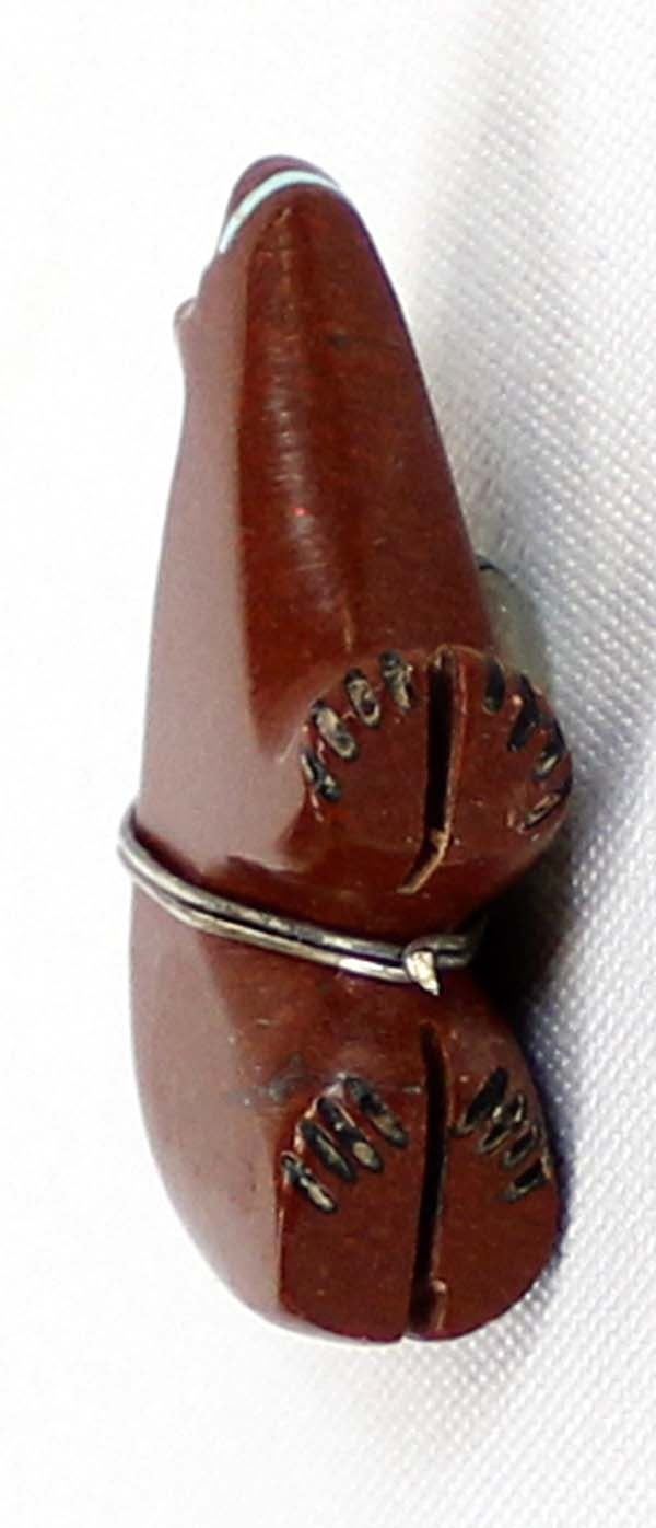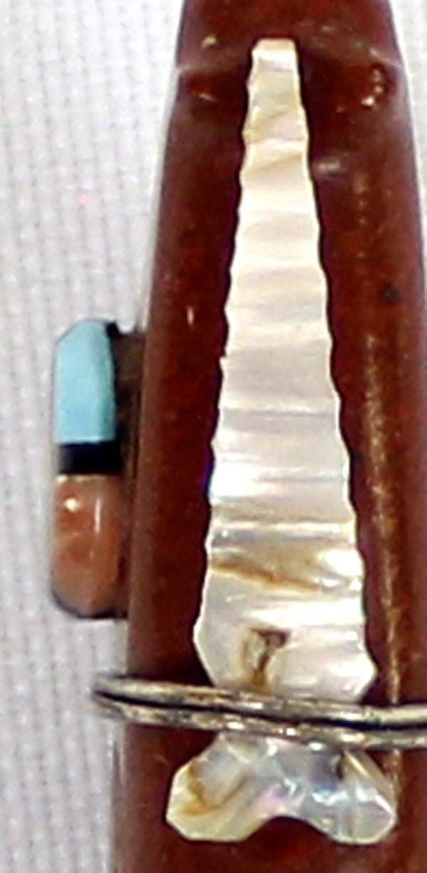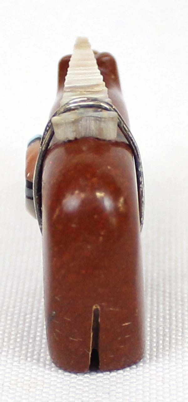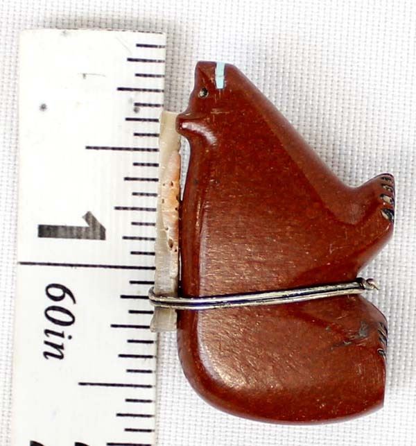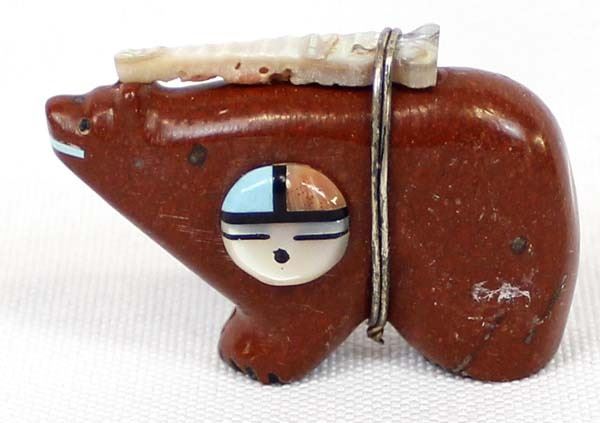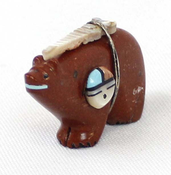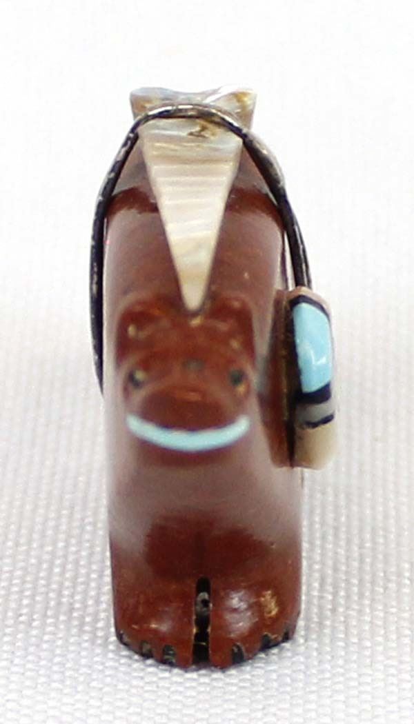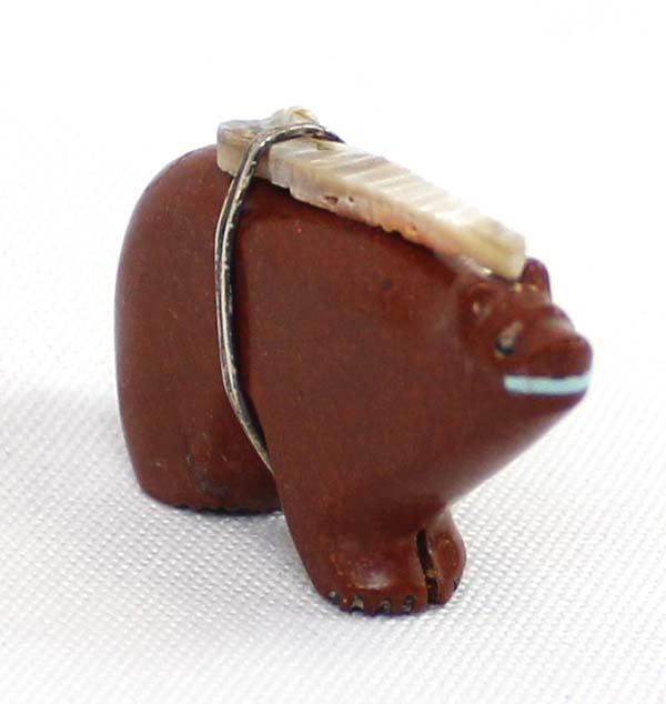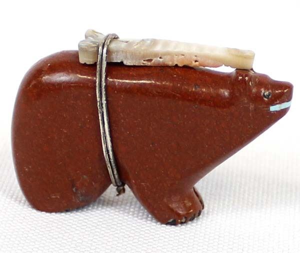 Native American Zuni Pipestone Bear Fetish by Darrin Boone, measures 1.5'' x 1'', carved abalone arrowhead and wire spirit bundle