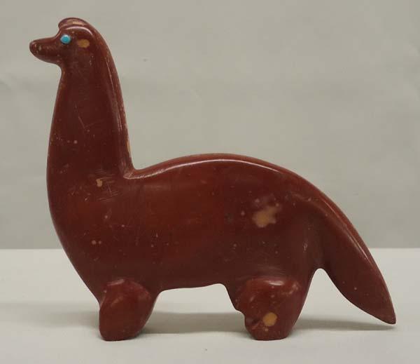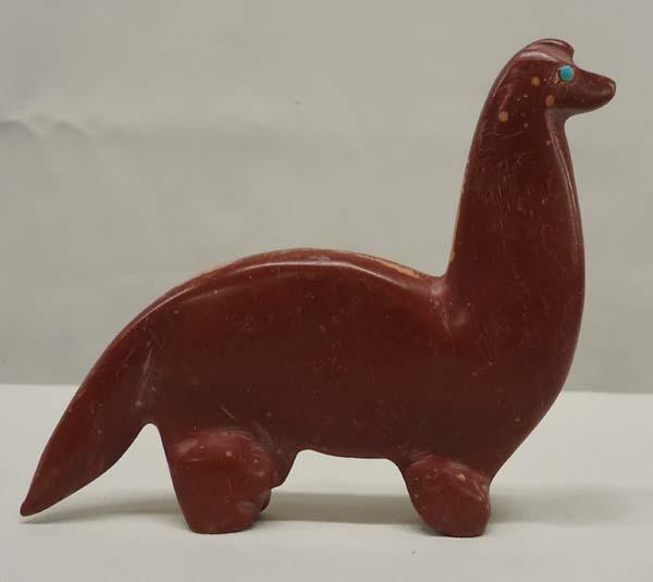 Zuni Pipestone Dinosaur Fetish Signed. Turquoise eyes. Measure approx. 3 1/3''H x 4 1/2''L x 1/3''W. SHI $20.