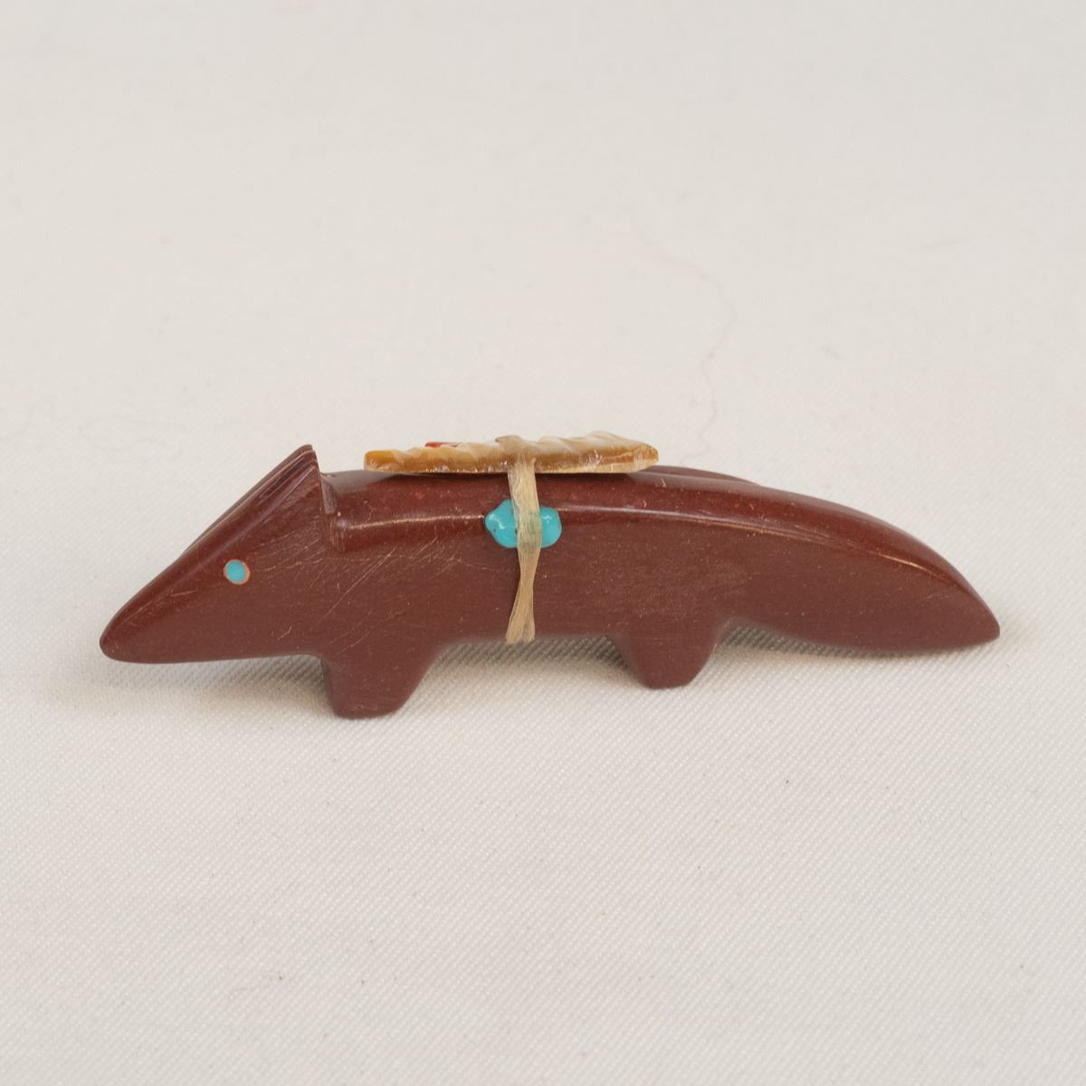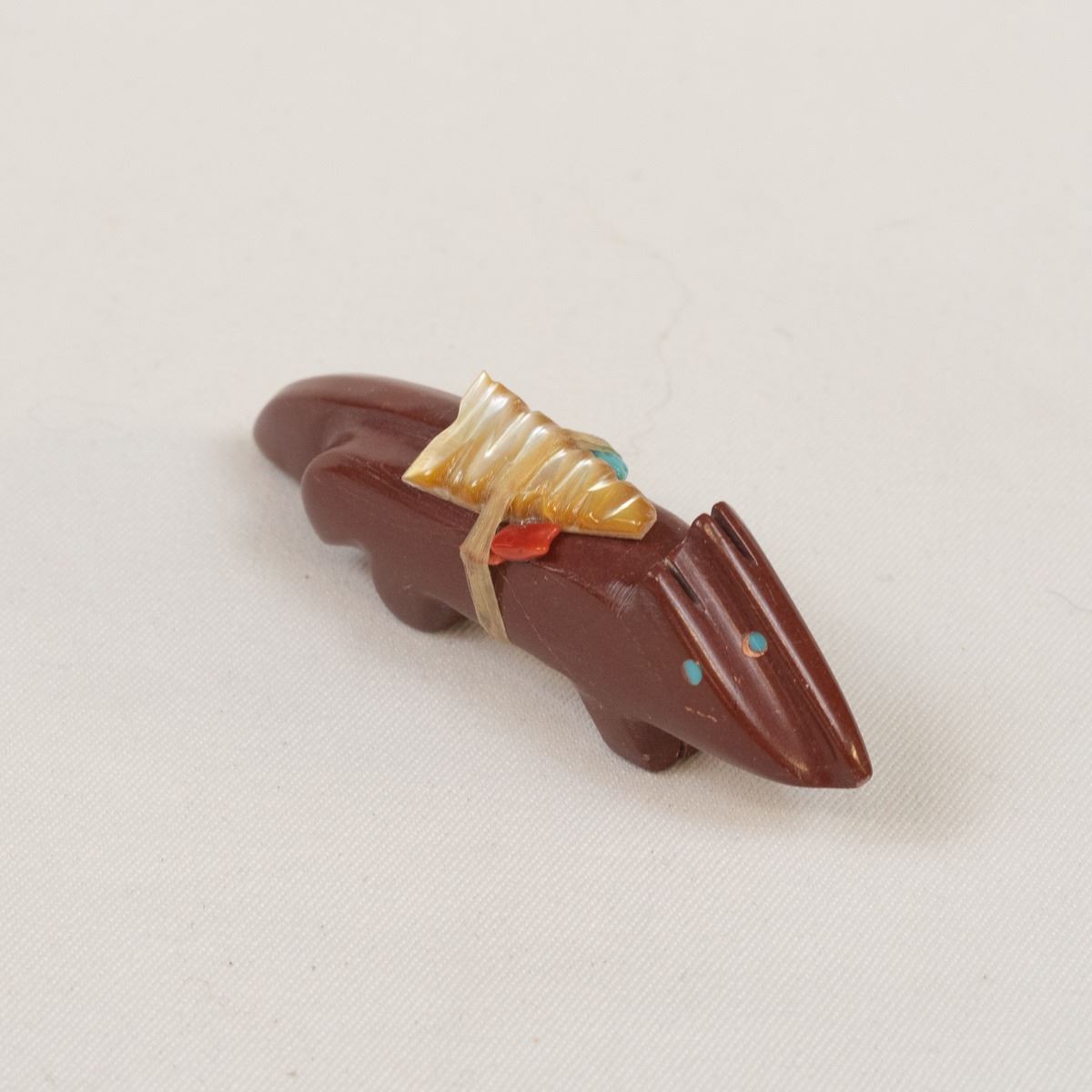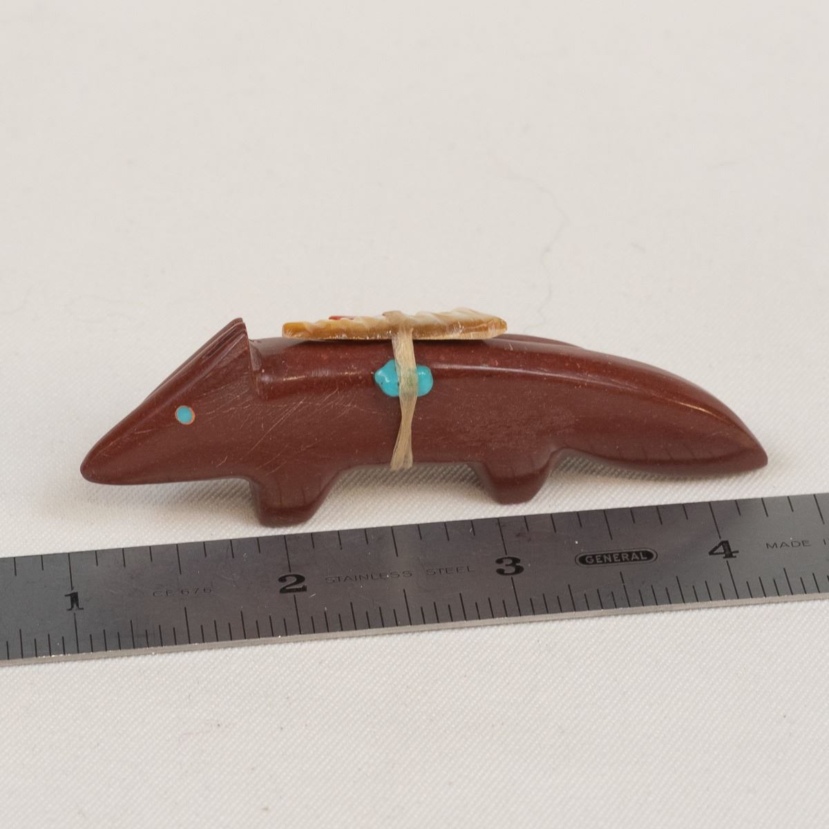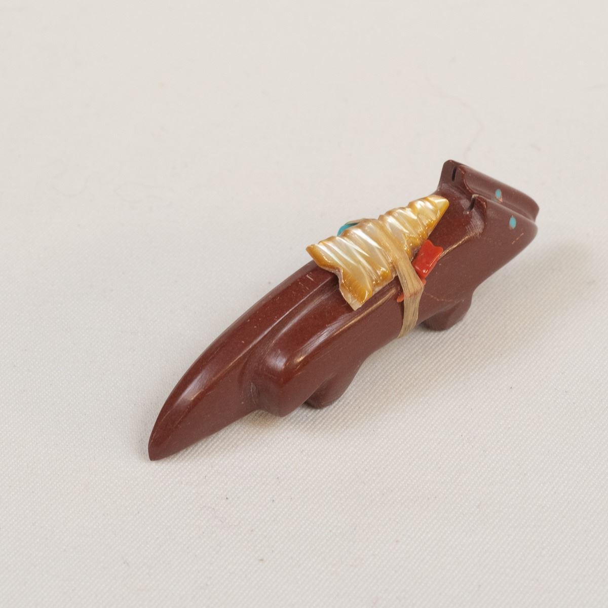 Older Native American Zuni Pipestone Double Wolf Fetish by Aaron and Thelma Sheche, measures 3.5'' x 1'' x .5'', turquoise eyes, carved gold lip shell arrowhead spirit bundle embellished with turquoise and coral