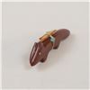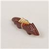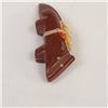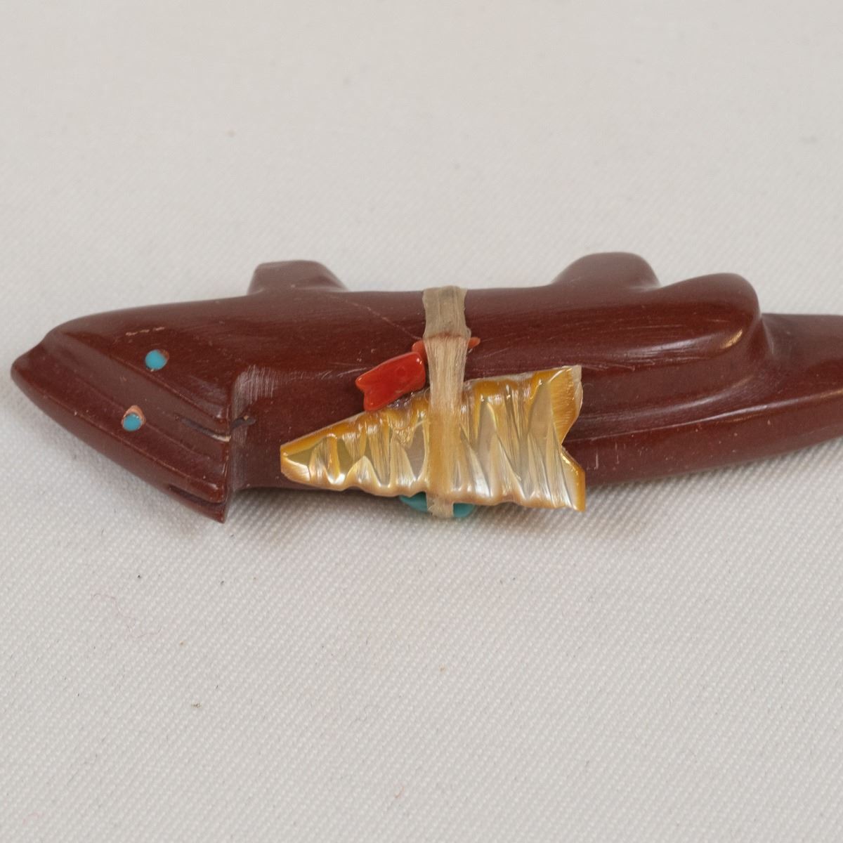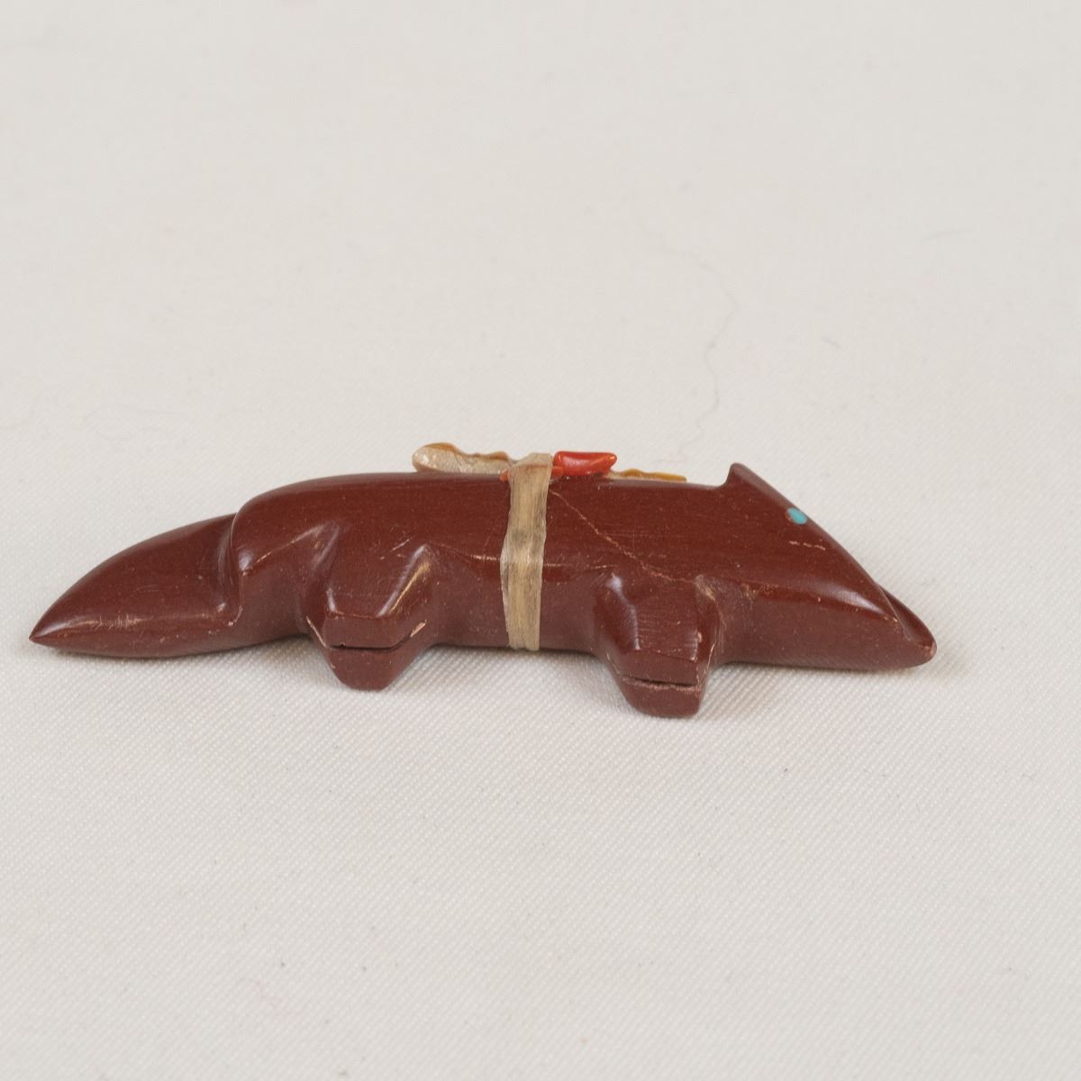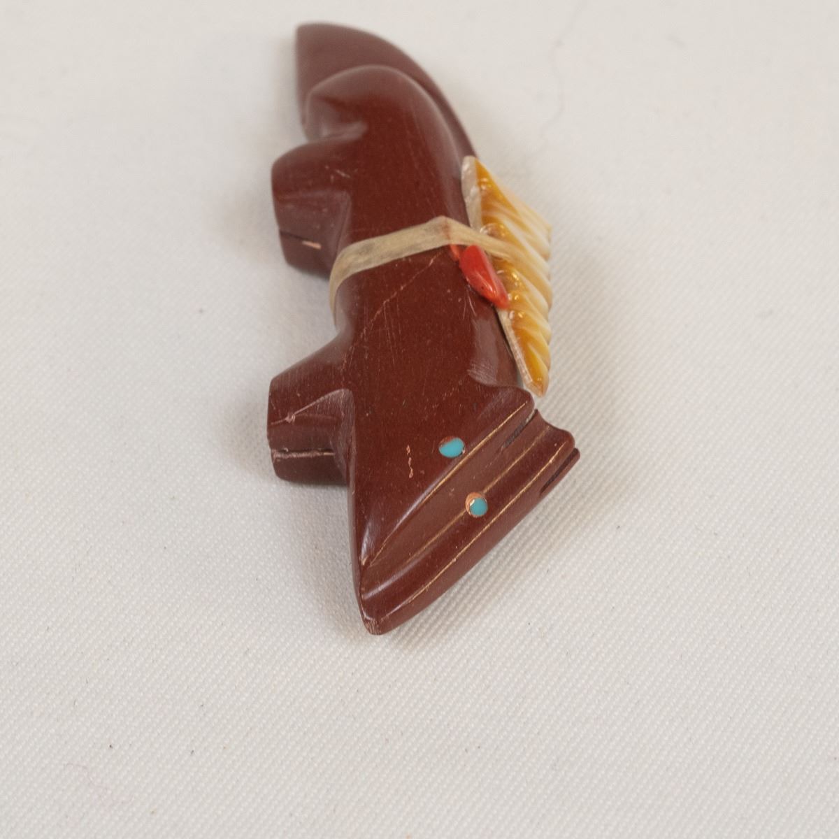 Older Native American Zuni Pipestone Double Wolf Fetish by Aaron and Thelma Sheche, measures 3.5'' x 1'' x .5'', turquoise eyes, carved gold lip shell arrowhead spirit bundle embellished with turquoise and coral