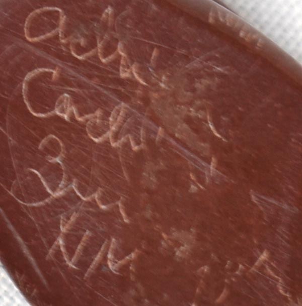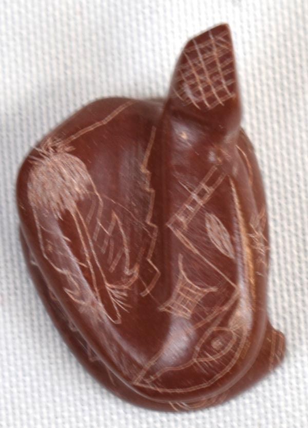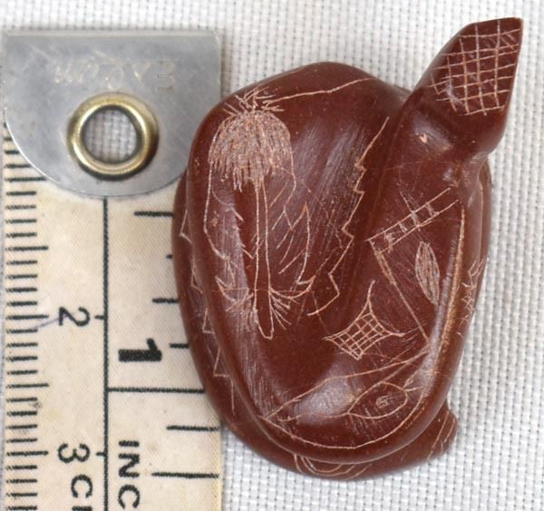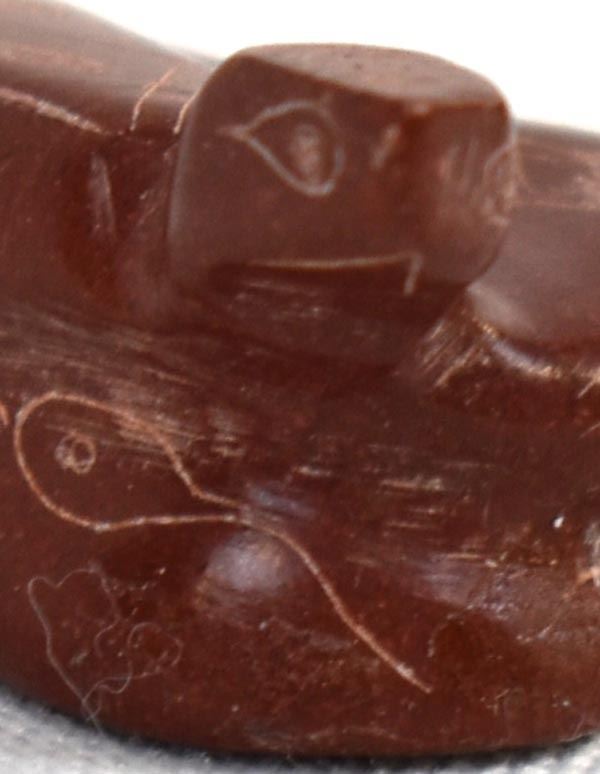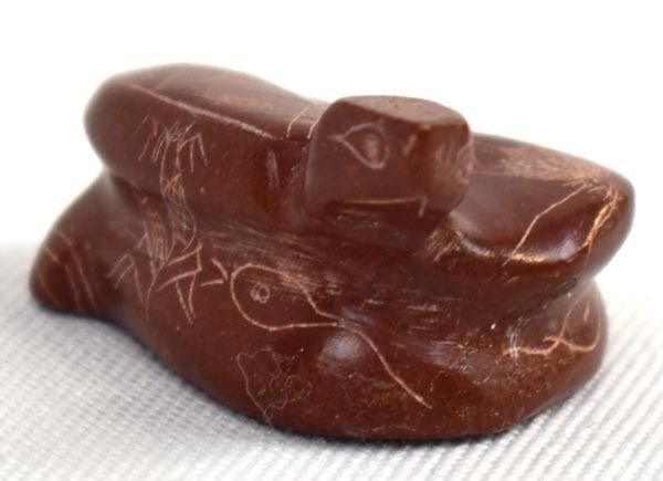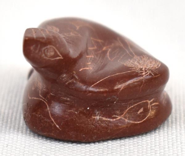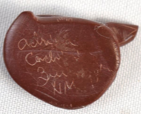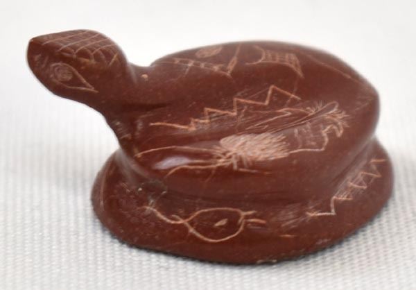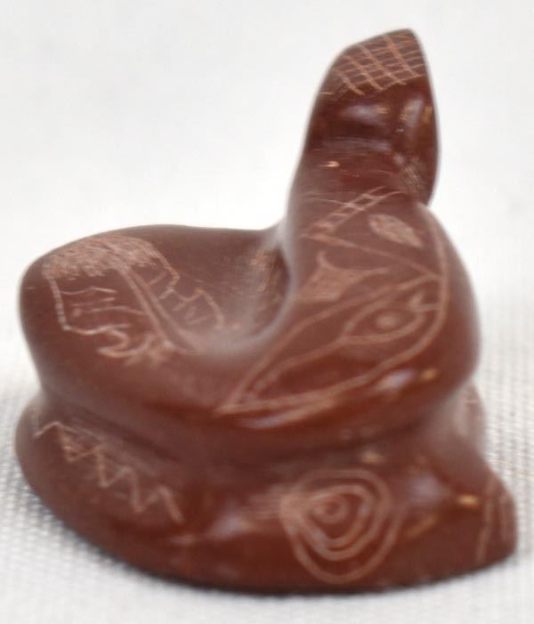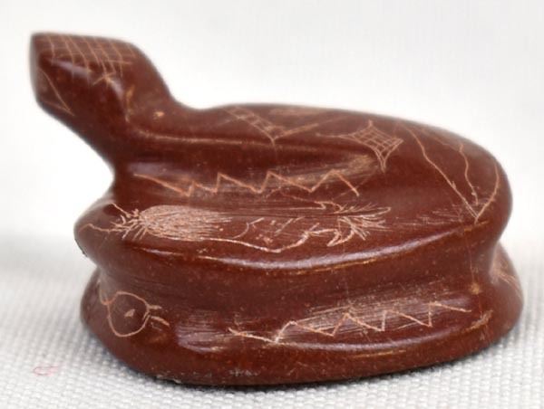 1998 Native American Zuni Pipestone Rattlesnake Fetish by Adrian Cachini, measures .75'' x 1'' x 1'' and is signed on the bottom, embellished with carved lines and designs