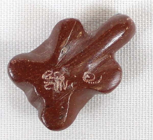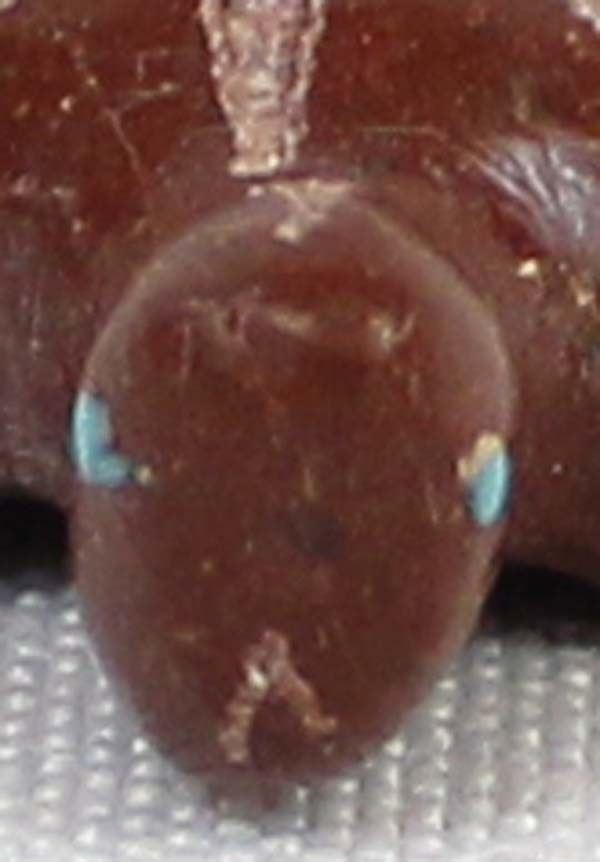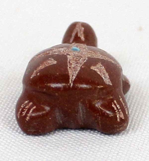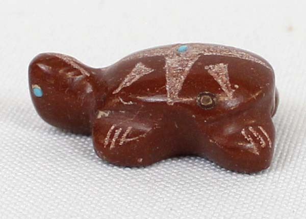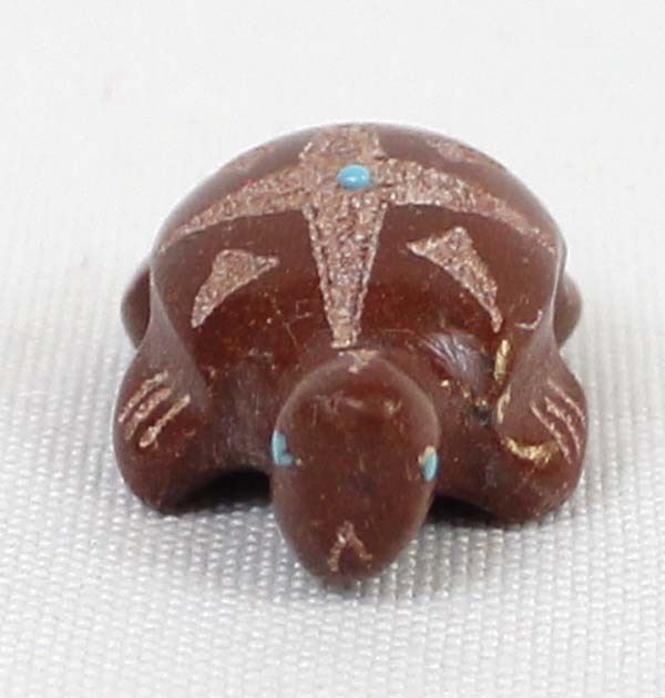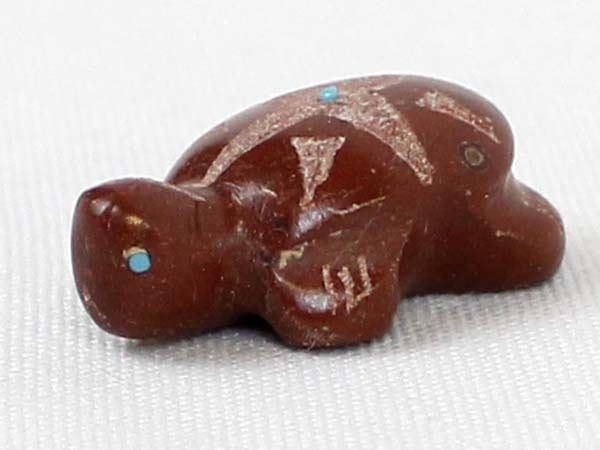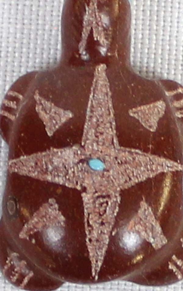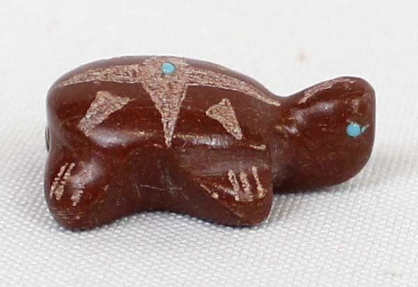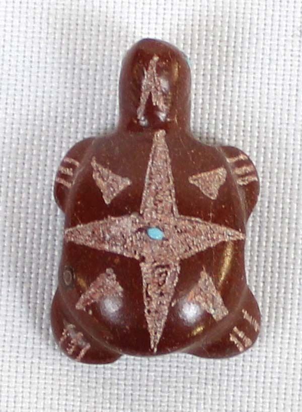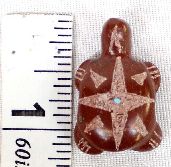 Native American Zuni Etched Pipestone Turtle Fetish by Russell Shack, measures 1.75'' x 1'' and has artist's initials on the bottom, embellished with turquoise microdot on shell, turquoise eyes