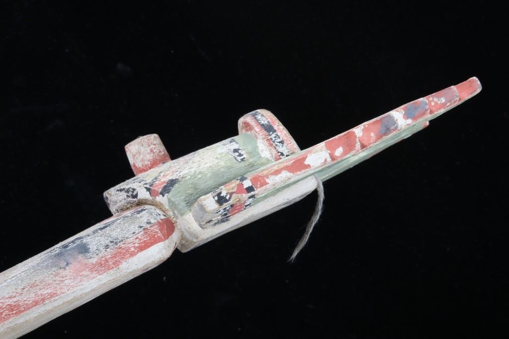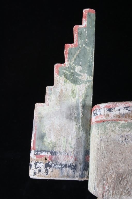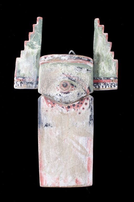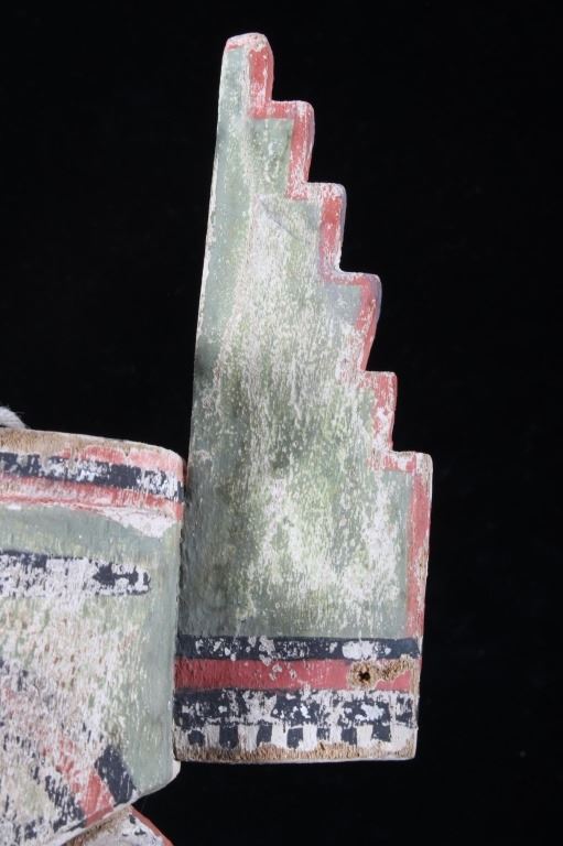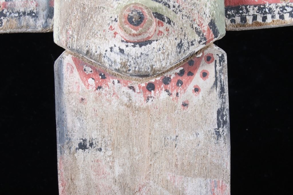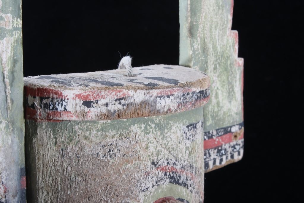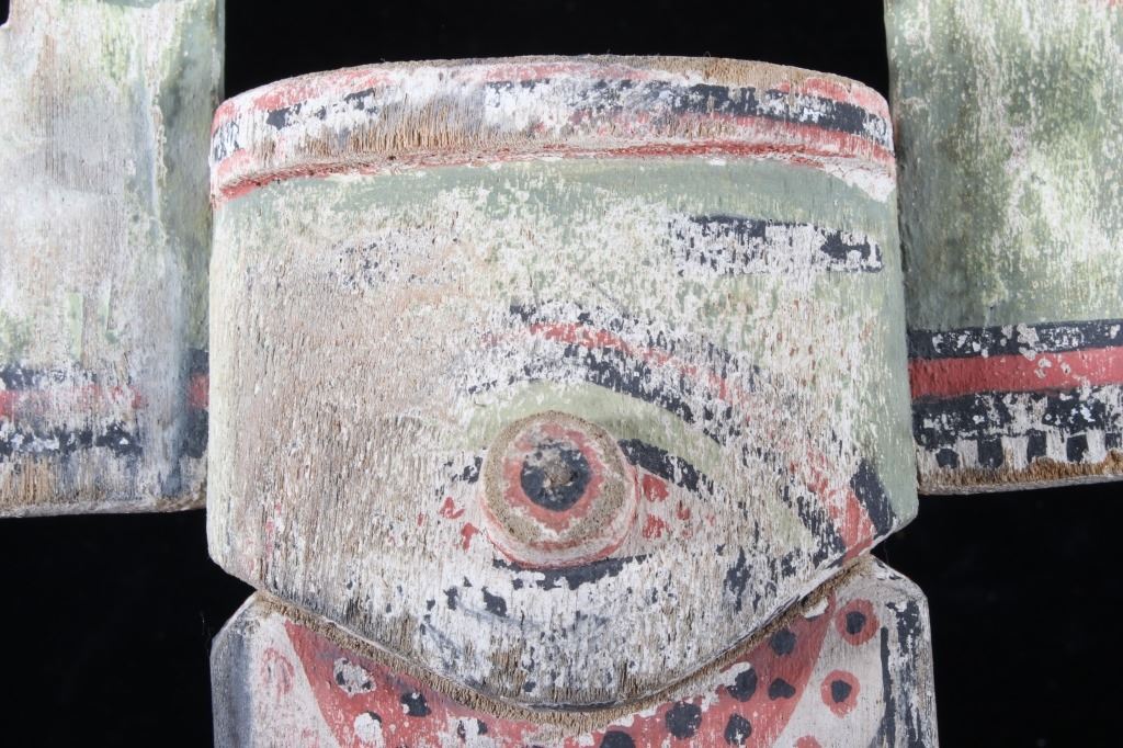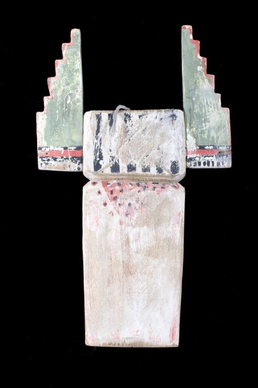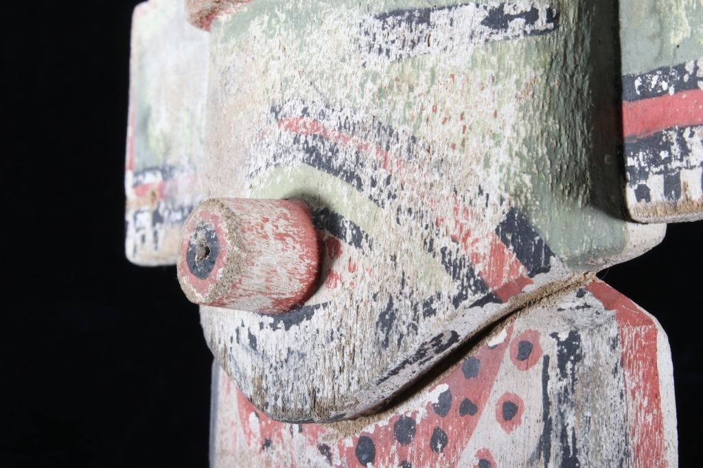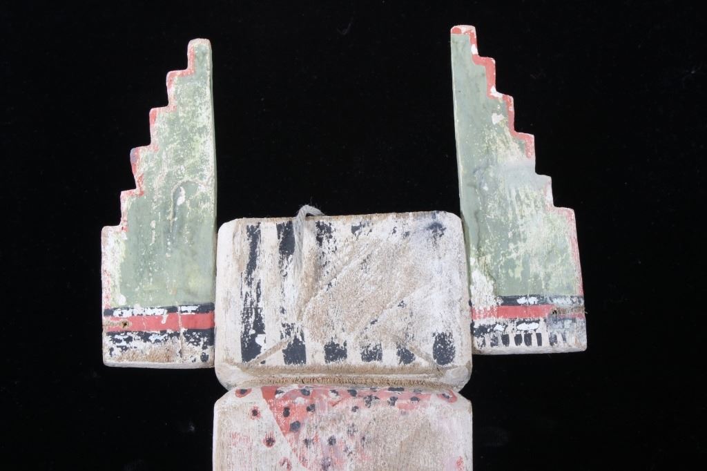 This is an excellent early original hand carved Zuni Native American Indian Kachina doll from circa early 1900 to late 1800’s. The exquisite piece shows the original polychrome pigment painted design and is carved from Cottonwood. The Kachina shows rectangular geometric eyes and is adorned in its presentation geometric painted dance outfit with impressive multi-tiered crown. The piece shows a round cylindrical nose and squared off base with an extremely rare “Sio Hemis” configuration. The Hemis and Sio Hemis Katsinas (Kachina) are considered some of the most beautiful and best known of all the early Zuni and Hopi Kachinas. Their elaborate headdress, called a Tableta, is partly responsible for their attraction. Other attributions that can be found in original early authentic examples are the wearing kilt with embroidered rain sash around the waist and dropping down one side of the hip along with the bundled chaff or evergreen ruff worn around the neck. The “Sio Hemis Ta-amu” comes from the Zuni and originated in the circa 17th Century. Provenance: From the renowned Sundog Fine Art Bozeman, Montana collection and collected by Bruce VanLandingham. Bruce VanLandingham was a pillar in the American Indian collecting community and a respected expert. Along with being an avid collector Bruce also was the sole owner of Sundog Fine Art Gallery in Bozeman which was both part museum and gallery. Overall this is a wonderful piece showing some paint loss and signs of wear, indicative of its early authentic age. Measures 6.5" wide and is 10.25" tall. Other examples have sold at auction in excess of $10,000 with this piece showing more detail and overall appeal.