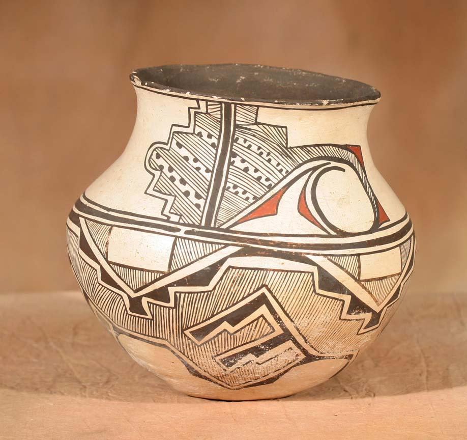 Zuni Polychrome Jar. 8 ¼" x 8". With hatching and bold abstract designs. Circa 1890-1900. (est $900-1,100). Provenance: Bethany College, Lindsborg, KS. For condition reports please visit: www.auctioninsantafe.com/cr2011.pdf