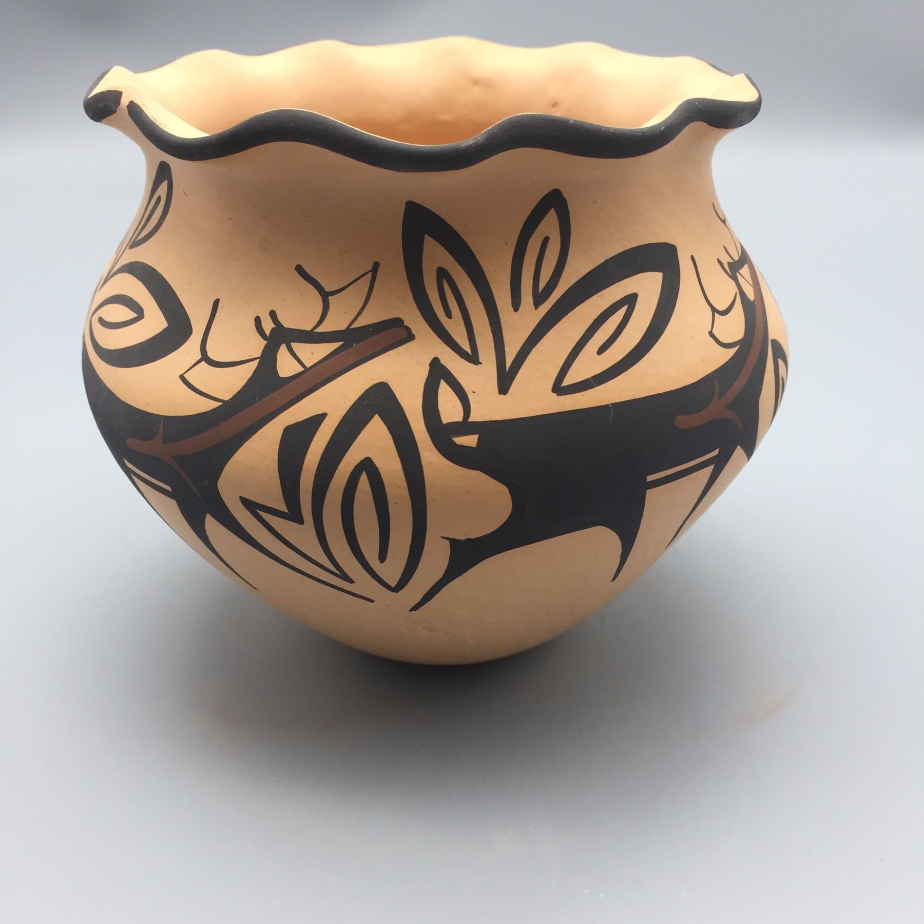 Maker: Peynetsa. Approx. Age: Circa 2011. Size: Measures 5 1/2” w x 4 3/4” h. Additional Info: Zuni dear pot. Condition: Good, New, old stock (NOS) from dealer who is retiring. Please look closely at the pictures - they are an important part of our description. Shipping: There will be a $8 handling / packaging fee for shipping this lot. The actual cost of postage will be added on top of that.
