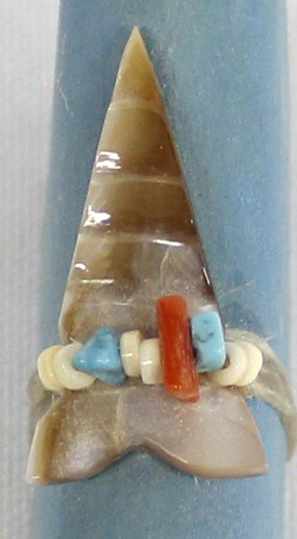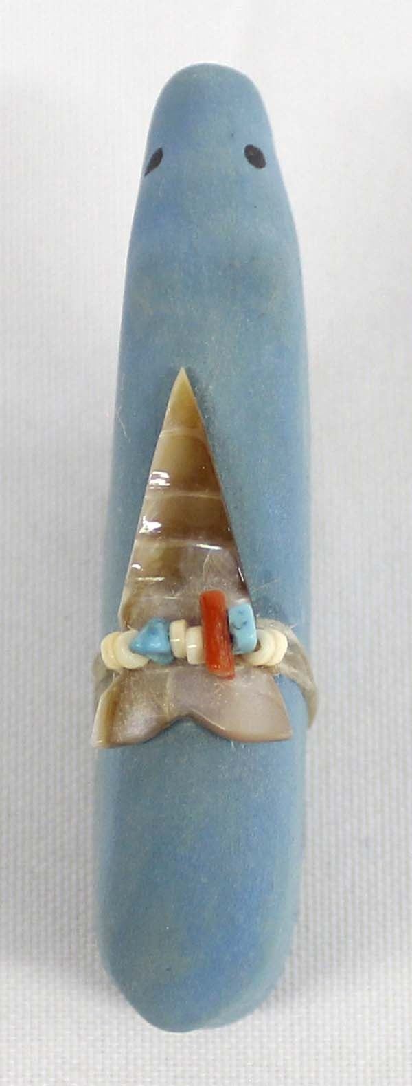 Native American Zuni Carved Pottery Bear Fetish by Lynelle Besselente Boone (Leland Boone's younger sister), measures 1.5''H x 3''L, artist's initials LBB on the bottom, spirit bundle is embellished with a carved red shell arrowhead, turquoise nuggets, coral, and shell heishi