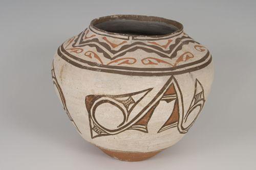 Zuni Pueblo Pottery: Strong, bold designs on a white slip commonly characterize the design elements of Zuni Pueblo pottery, as well as depictions of tadpoles, frogs, heartline deer and dragonflies. Pre-1930s specimens are rare, highly prized and highly publicized when they are offered for sale.