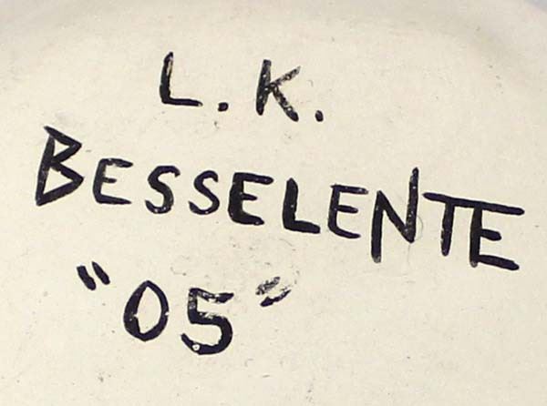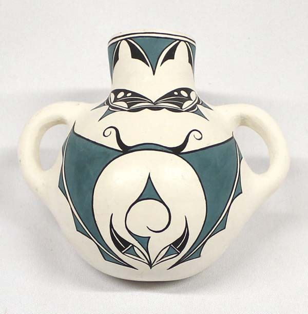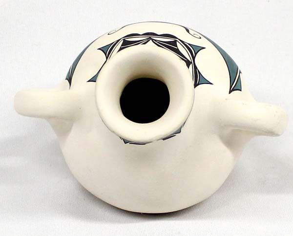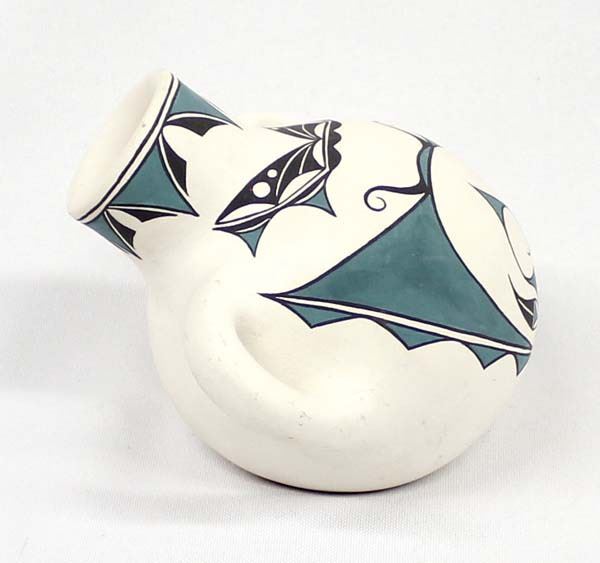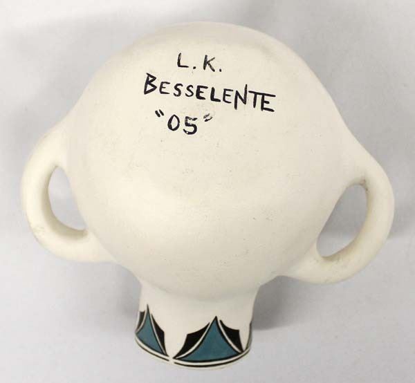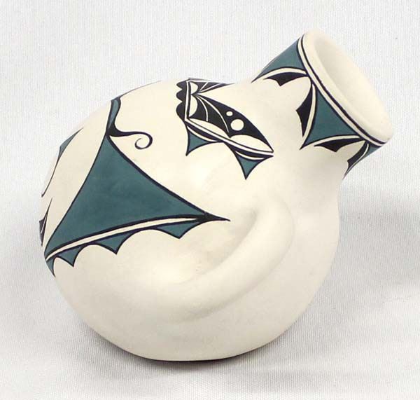 Native American Zuni Pottery Canteen by Lynelle Besselente Boone, measures 5.5''W x 4.5''L x 3.75''H and is signed on the bottom, butterfly and bat motif, thick walled pottery vessel