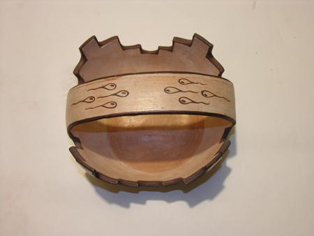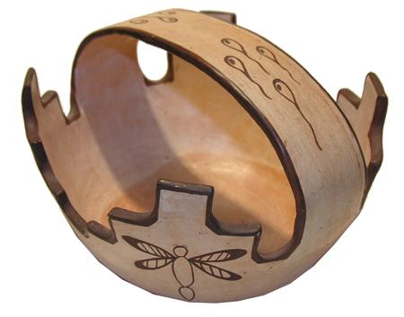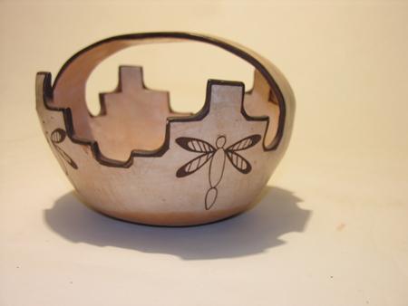 Circa Mid 1900s, Marvelous Zuni prayer meal pottery basket decorated with dragonflies and tadpoles and stepped rim on black and white slip, hallmarked. 5-3/4" x 8"
