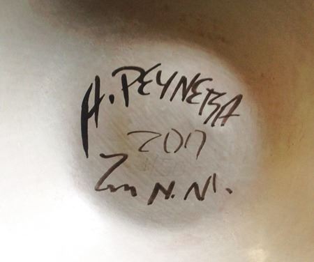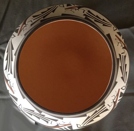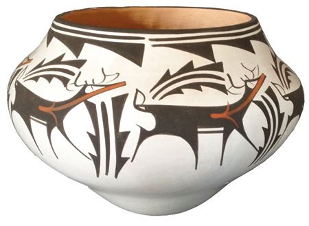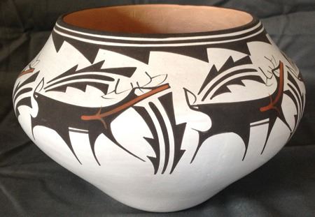 Ca. 2017, Contemporary version of the traditional pottery jar with heartline deer figures, signed. 6" x 9"