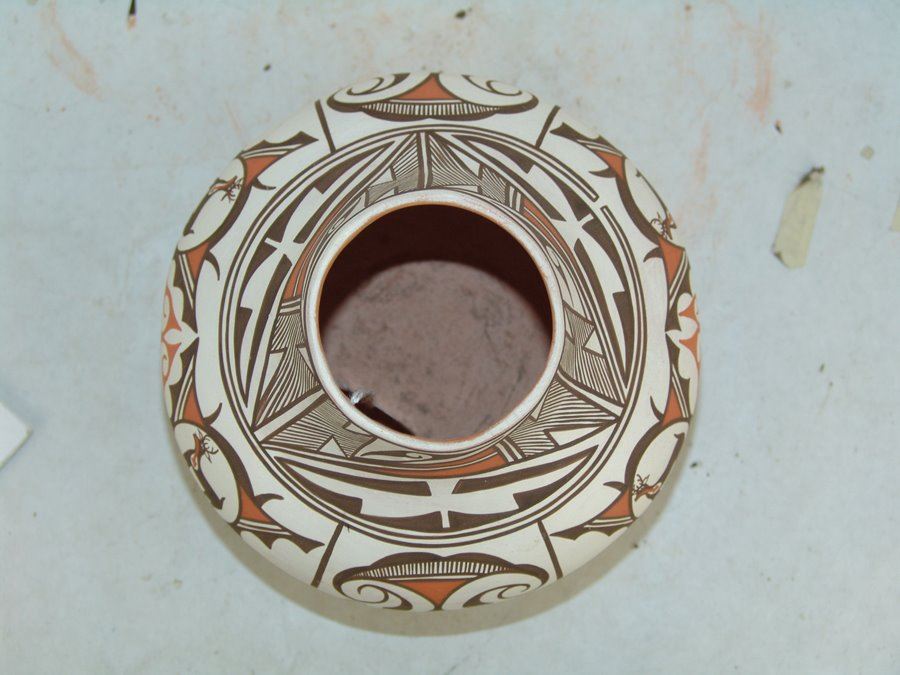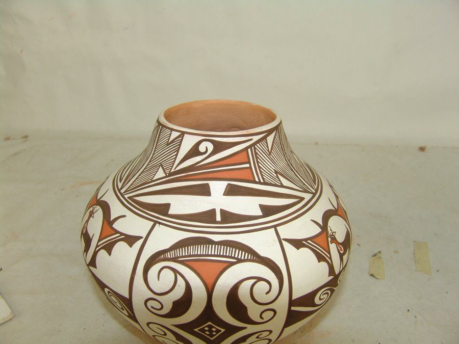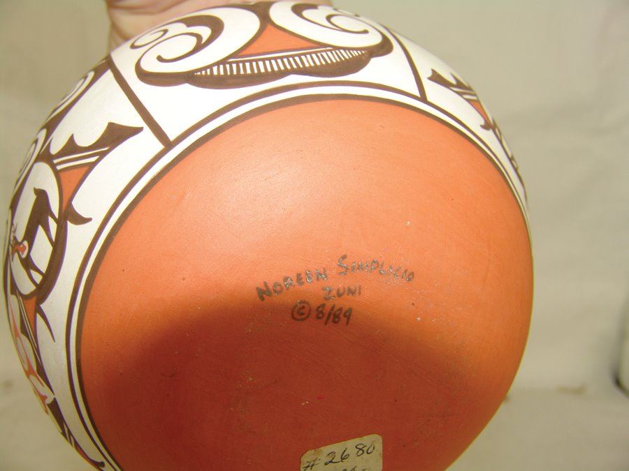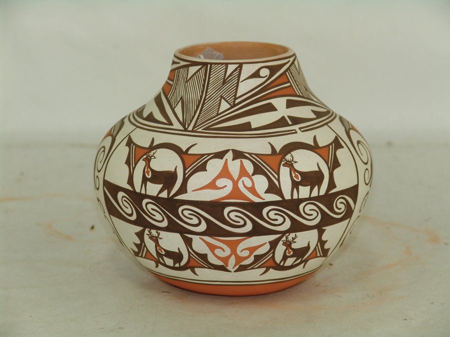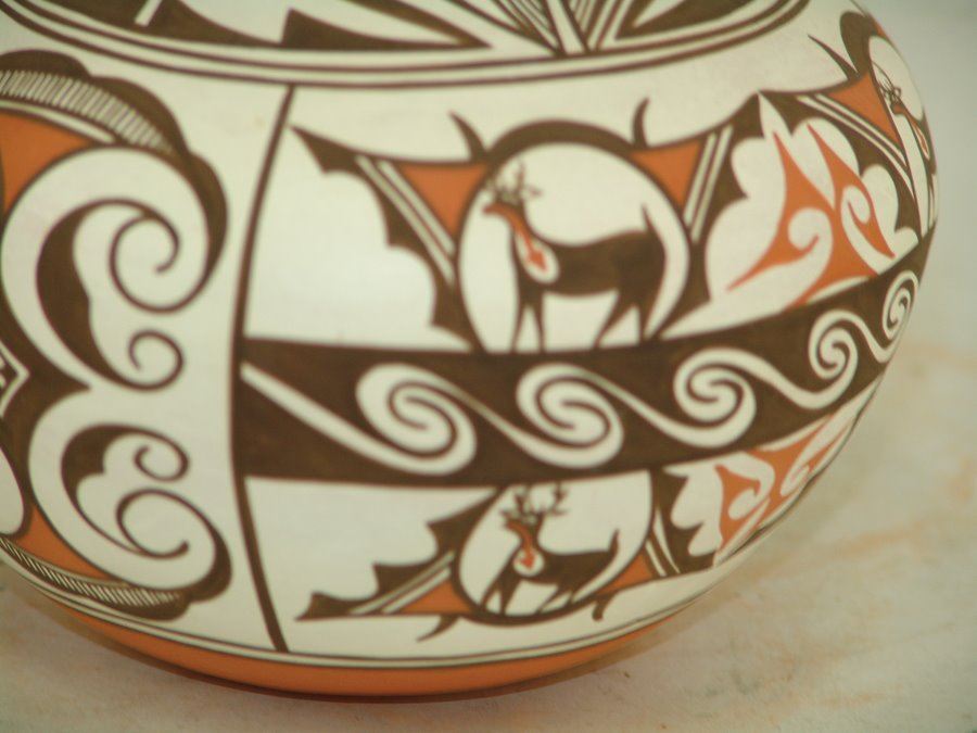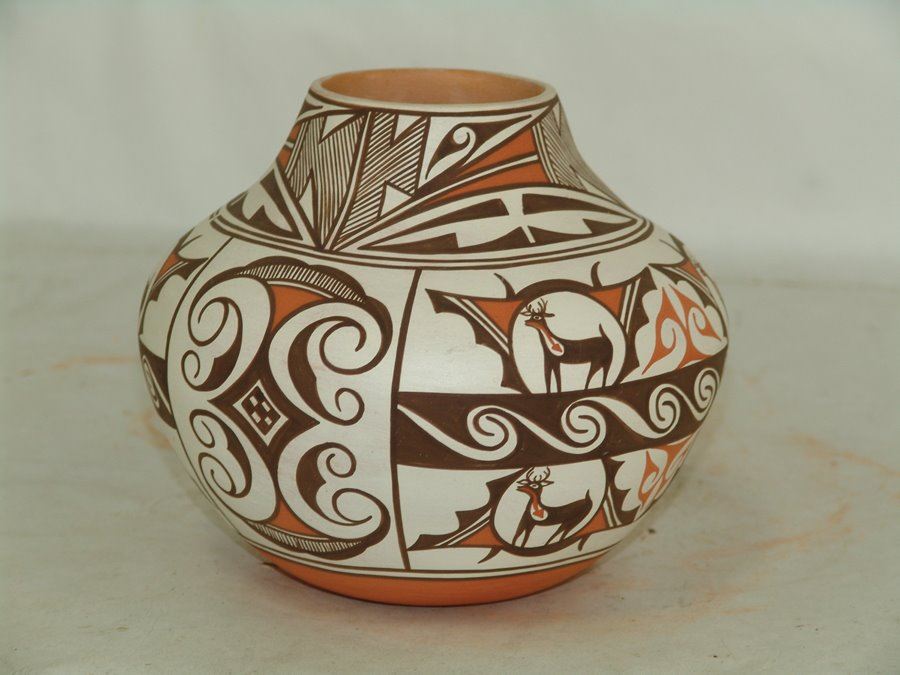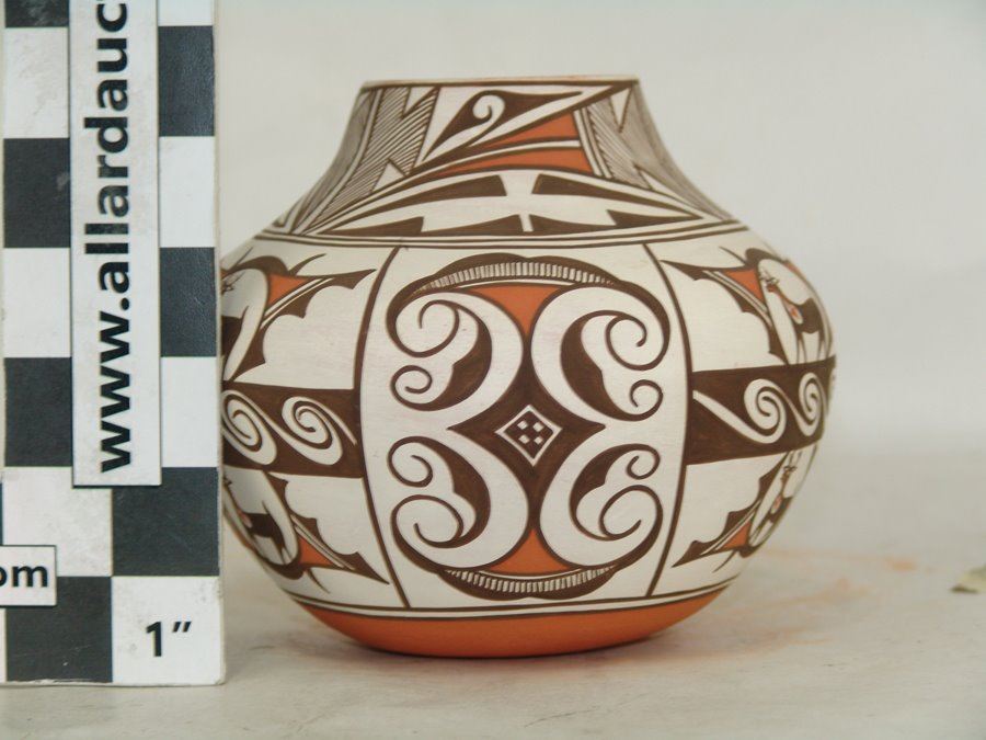 Fine smaller polychrome jar with intricate design including heartline deer, fine line forms, and other traditional symbols. Very good condition.,Ca. 1989,6-1/2" x 7"