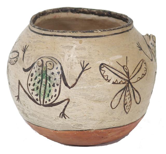 Circa 1880, Rare, early Kiva pot decorated with frogs and butterflies; no cracks or restoration. 6" x 7"