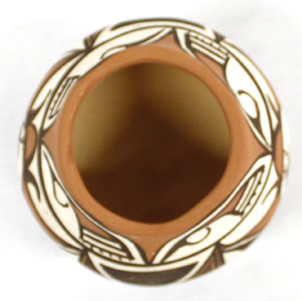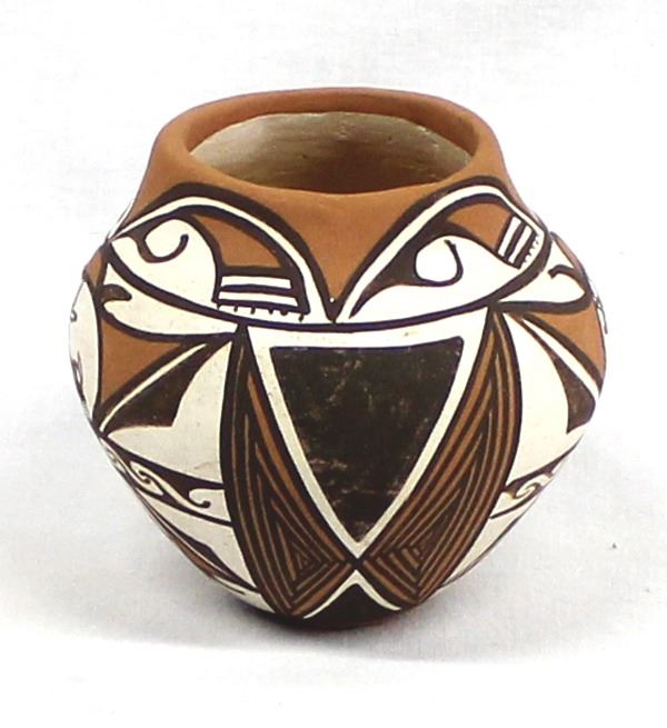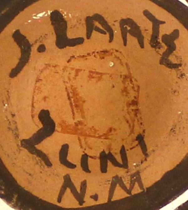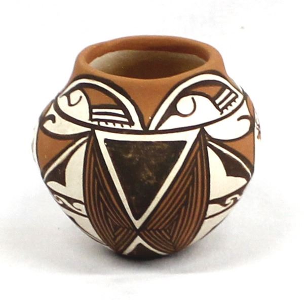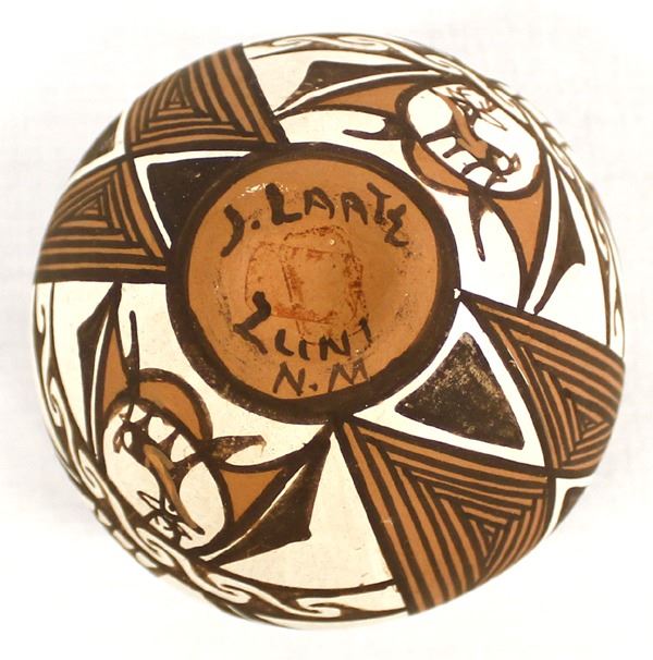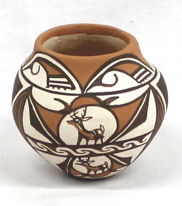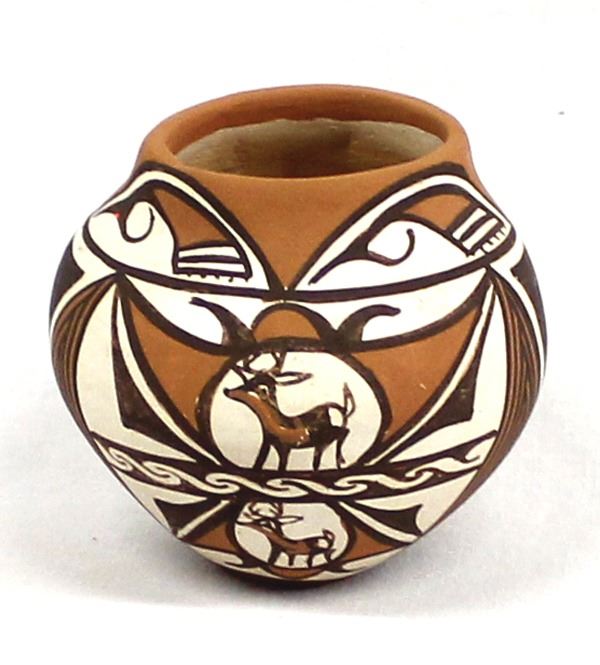 Native American Zuni Pueblo Pottery Jar by Jennie Laate (1933-1994), measures 2'' x 3'' and is signed on the bottom, heartline deer motif, beautiful jar, FYI: ''Jennie Laate (1933-1994) was from Acoma Pueblo and married Noel Laate from Zuni Pueblo. Jennie taught pottery classes at Zuni High School. She helped revive Zuni pottery and in 1979 she was the only Zuni potter at Santa Fe Indian Market. Most of today's potters at Zuni learned from her classes. She focused on traditional clay and materials for the pottery and today her pieces still have the wonderful charm of the revival Zuni designs.''