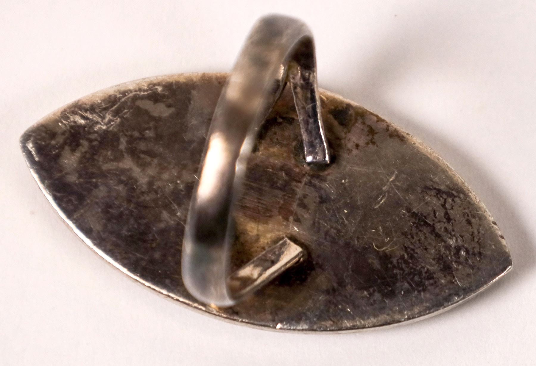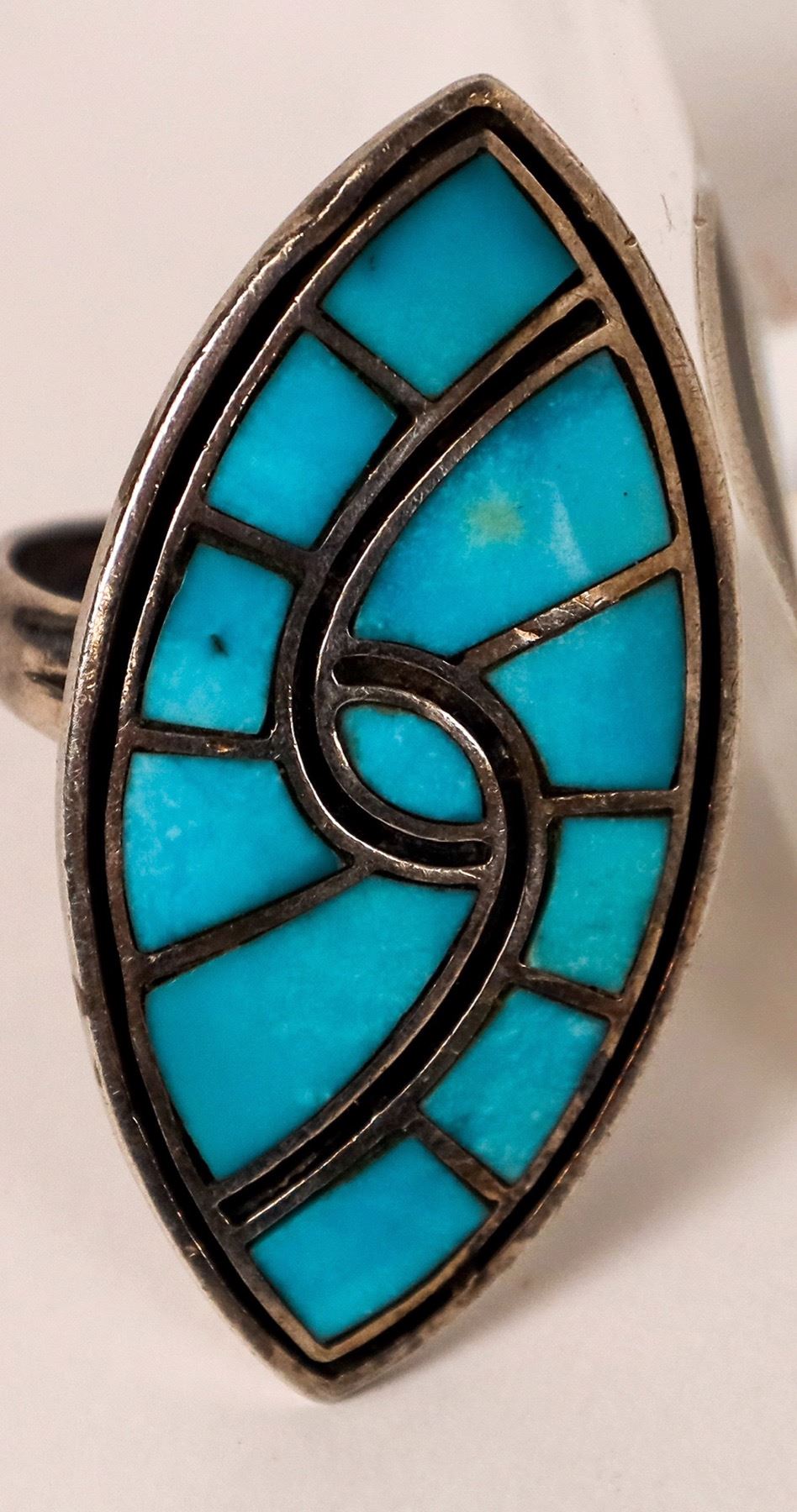 Striking turquoise and silver inlay ring. Probably by Zuni artist Amy Quandelacy, unsigned. This is her signature design with Inlaid sleeping beauty turquoise stones and a double black swirl hummingbird symbol. 1.5” x .75” City: State:New Mexico Date: