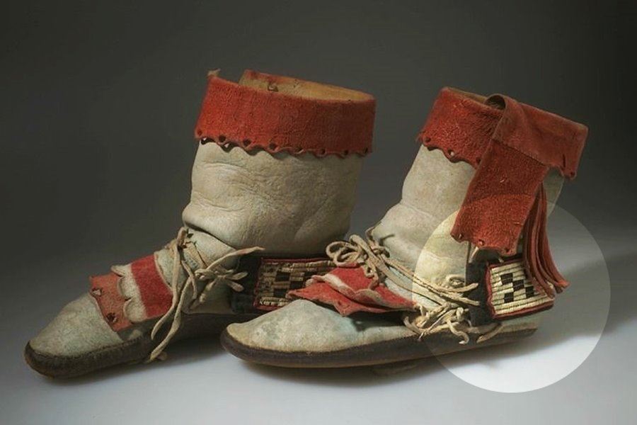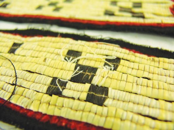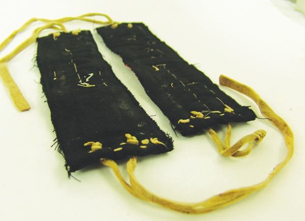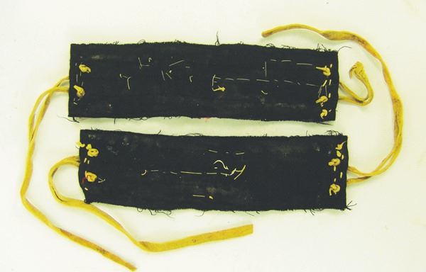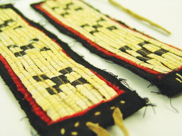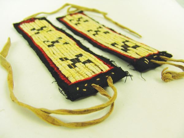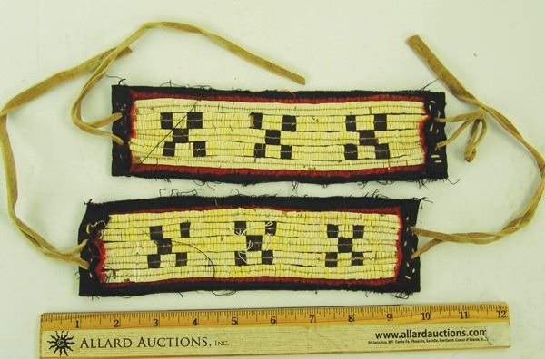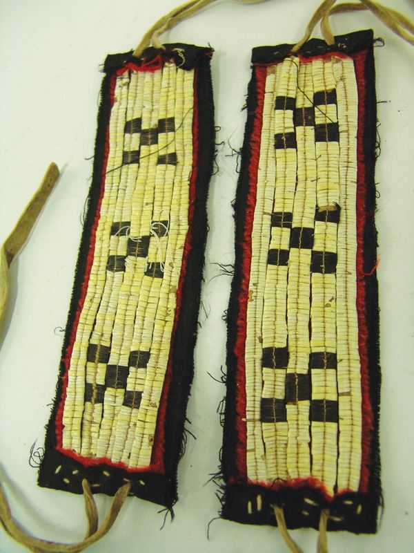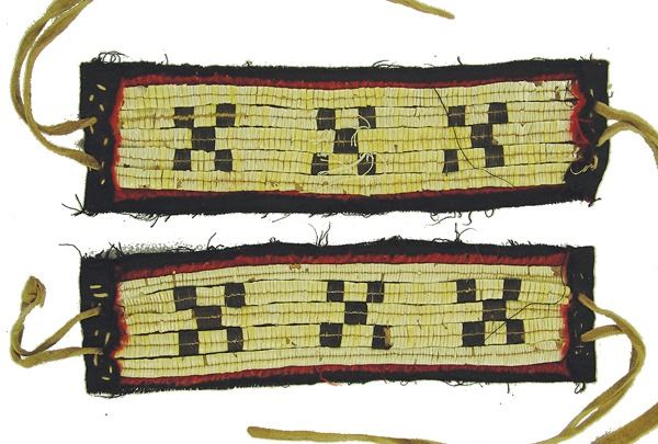 Rare pair of flat-quilled heel straps as worn by dancers on the backs of their traditional moccasins. These even have the black crosses in the design. Good, well used, condition. Early/Mid 1900s 9" x 2-1/2"