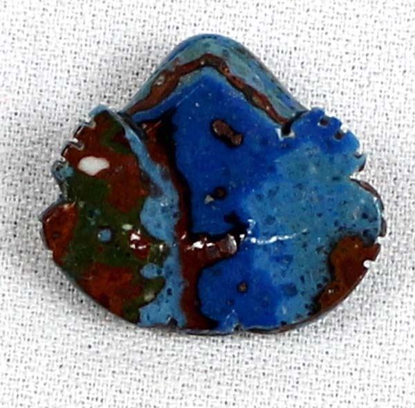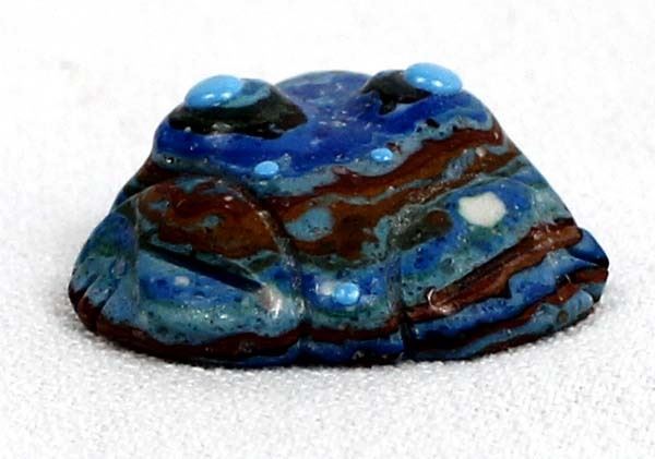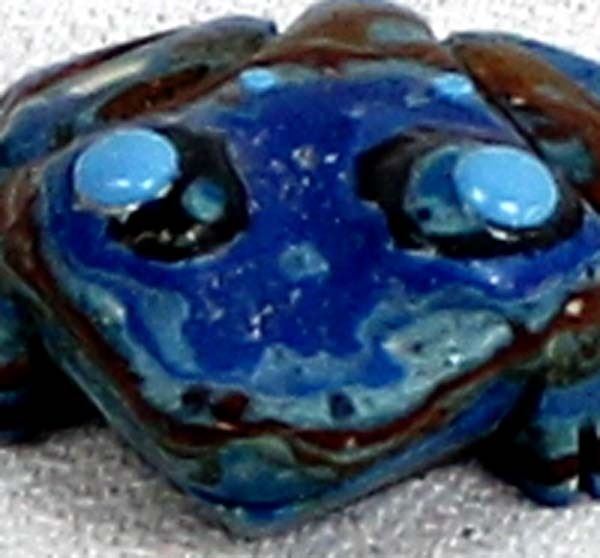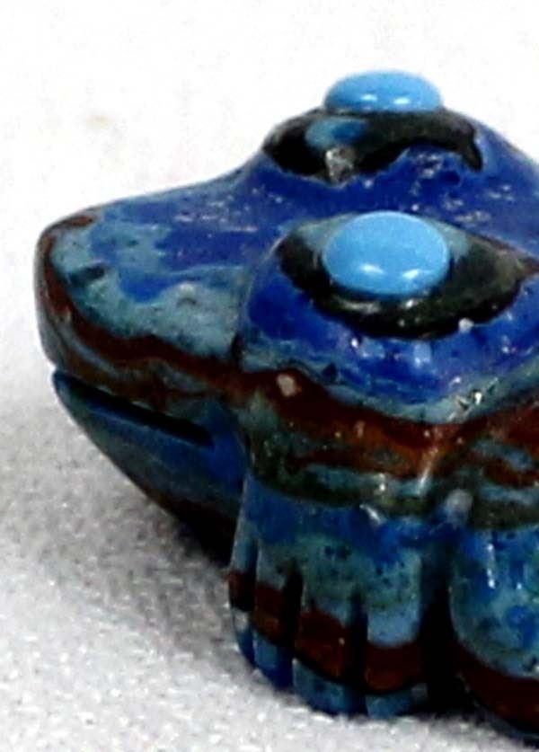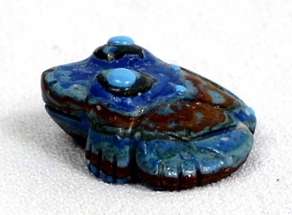 Native American Zuni Rainbow Calsilica Frog Fetish by Georgette Quam, measures 1'' x 1'' x .5'' and is signed on the bottom, embellished with turquoise spots and eyes