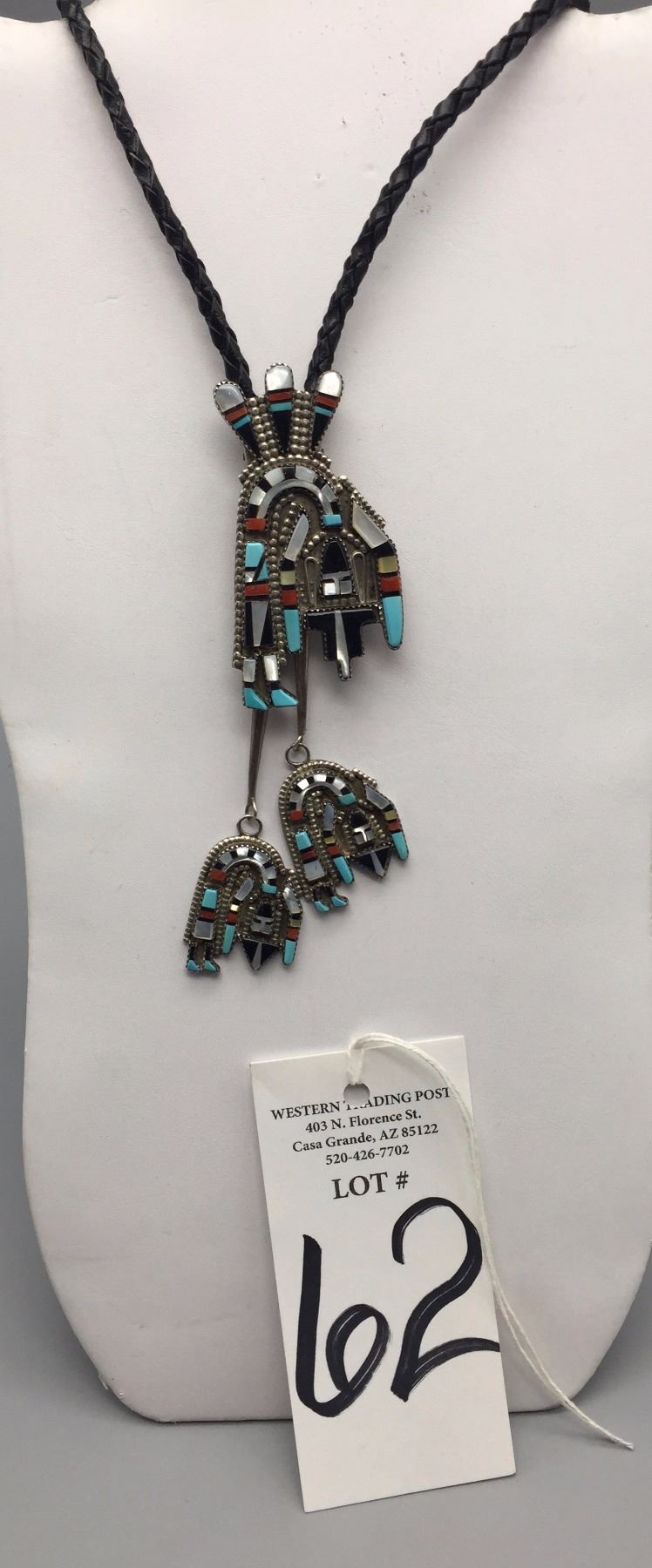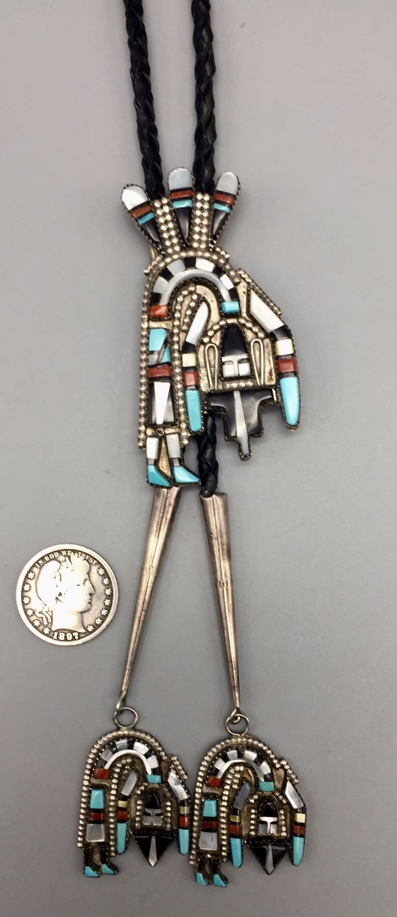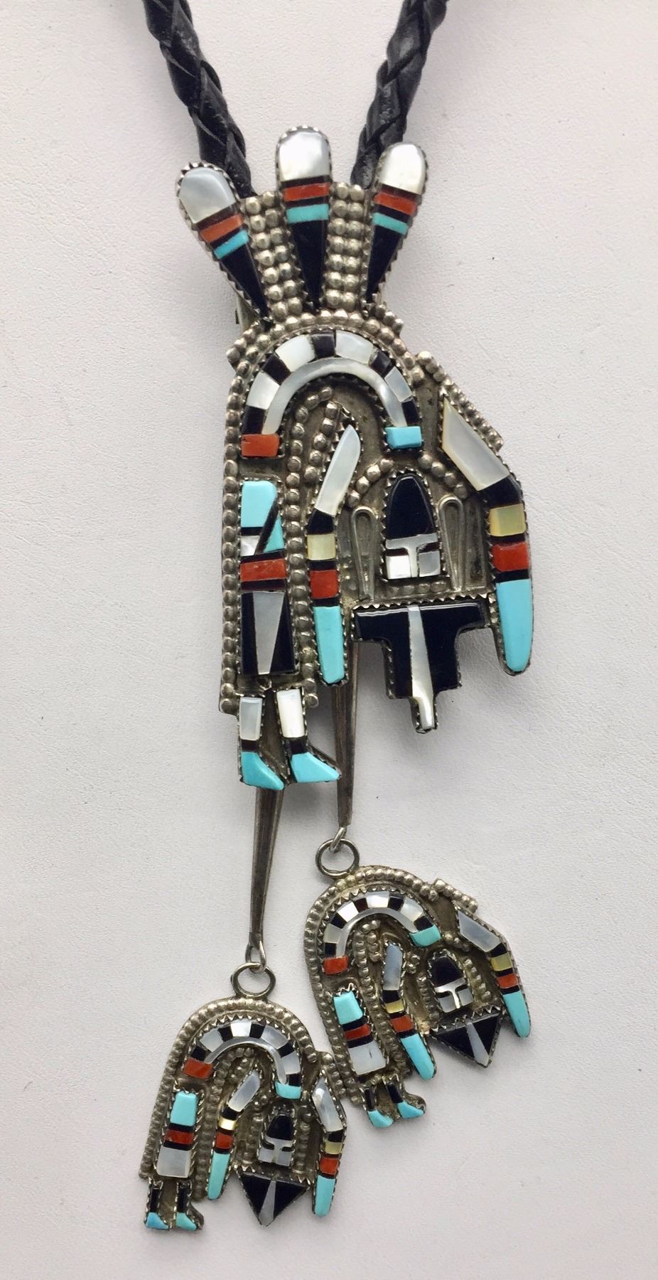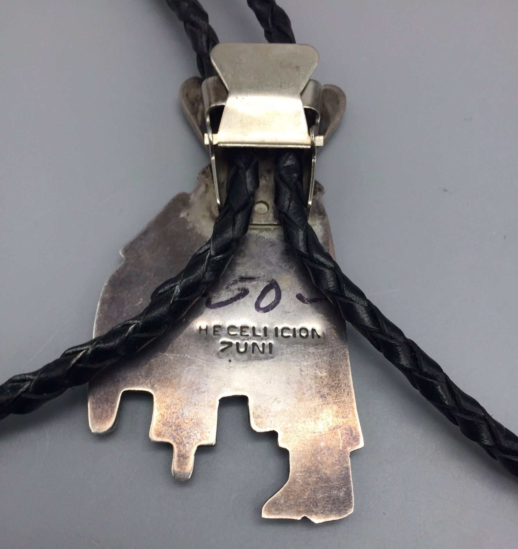 Maker: Hallmarked HE CELLICION, mark of Herbert & Esther Cellicion, Zuni. Approx. Age: Vintage (Circa 1970s). Size: Overall width of the slide is almost 1 3/8" x 2 7/8“ (longest points). It's on a 32" braided black leather cord with sterling tips. Weighs 47.3g with most of the cord on the scale. Additional Info: Mother of pearl, turquoise, onyx and sterling silver inlay. Rainbow Man design with matching tips. Condition: Good for it’s age. Normal wear expected. Please look closely at the pictures - they are an important part of our description. Shipping: There will be a $5 handling / packaging fee for shipping this lot. The actual cost of postage will be added on top of that.