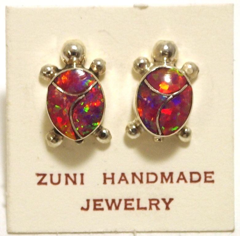 Zuni Red Opal Inlay Sterling Silver Turtle Post Earrings - Vernon Waikaniwa