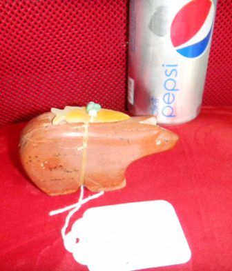 Zuni Red Stone Fetish of Bear with a shell arrowhead on back and turquoise and shell beads wrapped with sinew. There are turquoise eyes also. Item measures 4x2 and half by one inch. Excellent condition from estate from Chula Vista, California. Shipping $15.00
