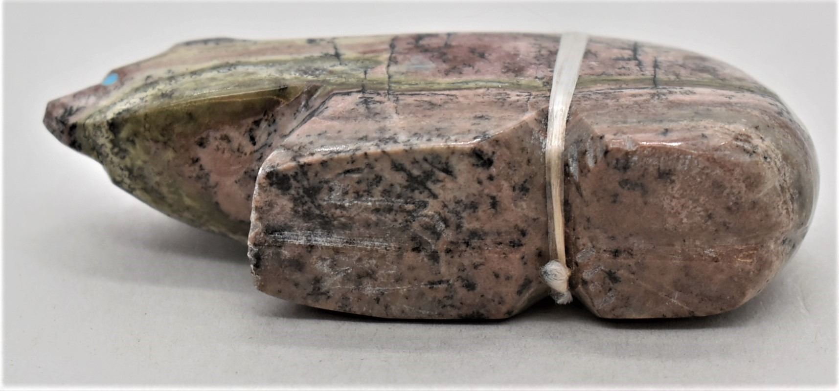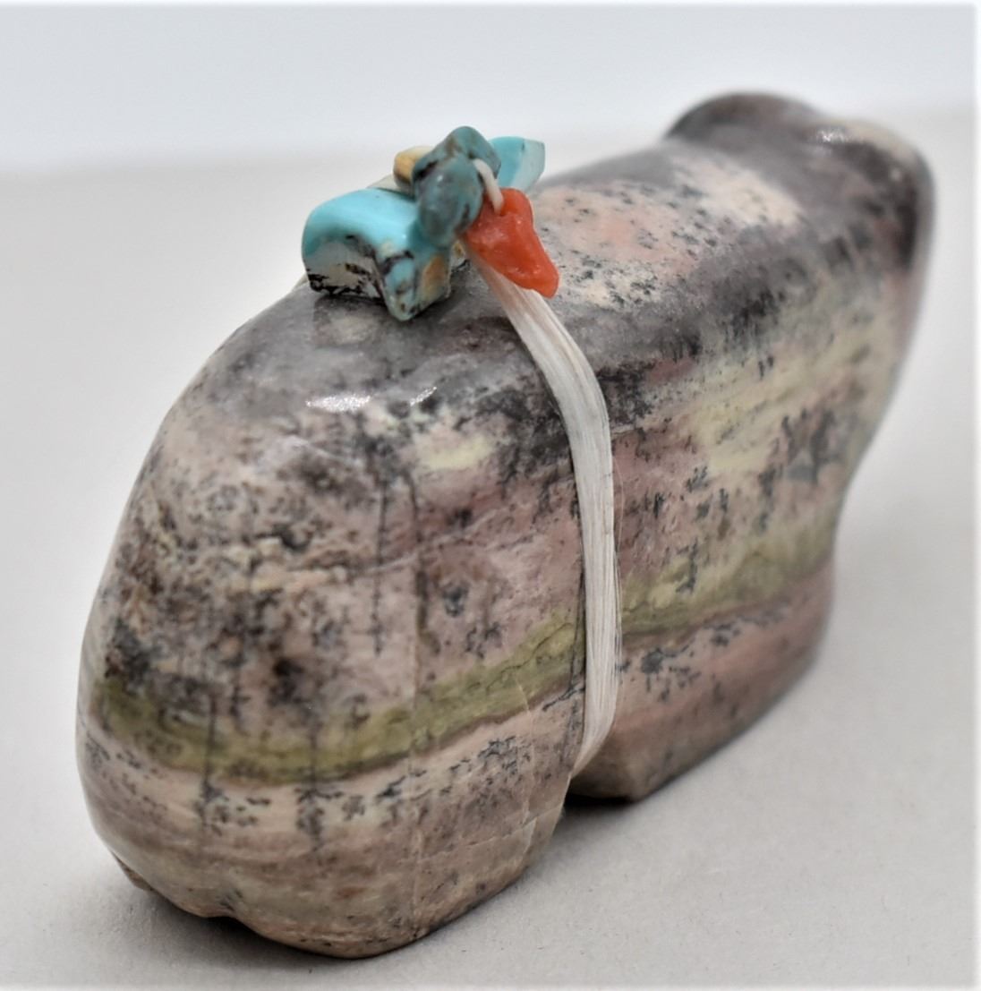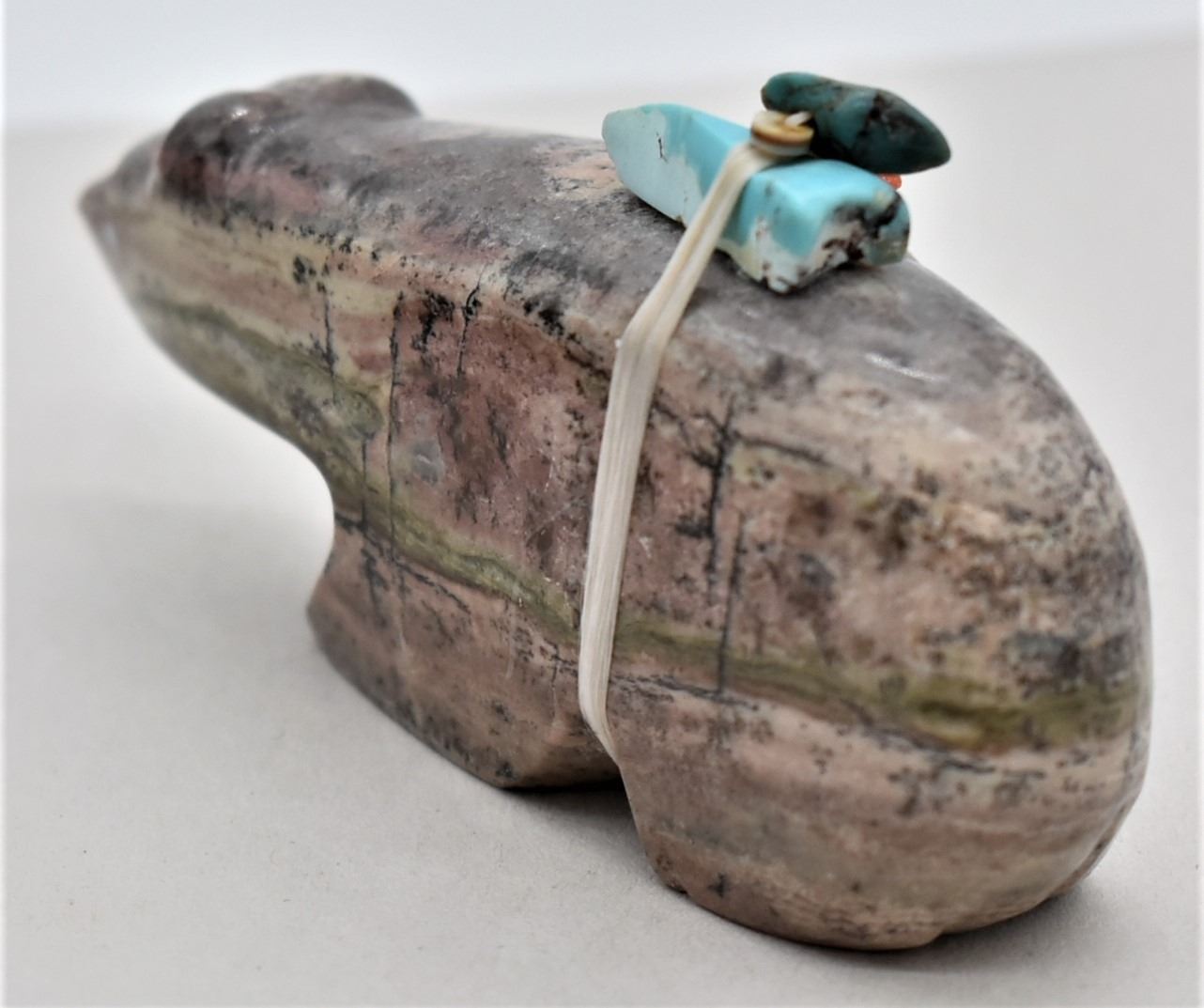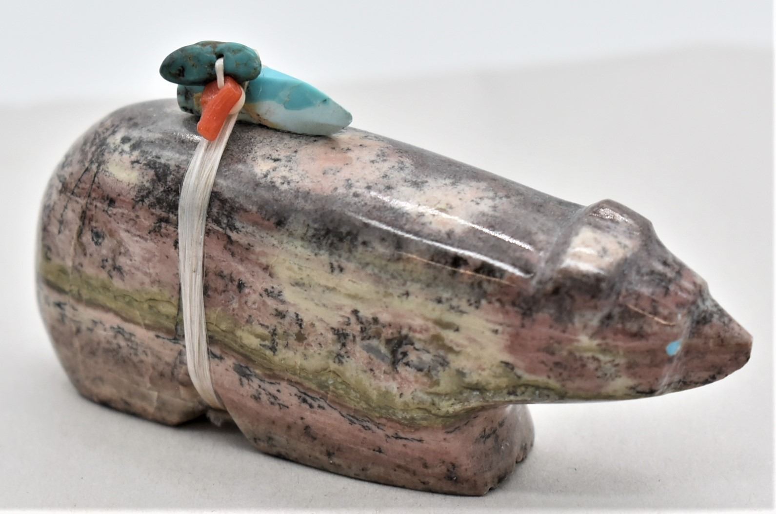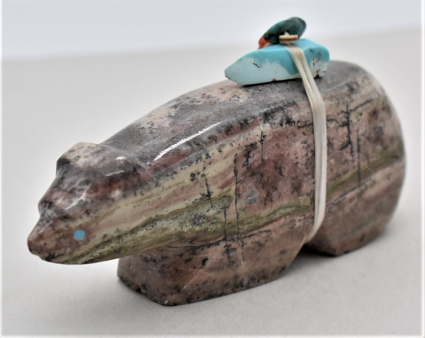 Native American Zuni Rhodonite Bear Fetish by Michael Mahooty, measures 2.5'' x 1.5'' and has artist's initials on the bottom, carved turquoise arrowhead spirit bundle with small piece of coral, turquoise eyes