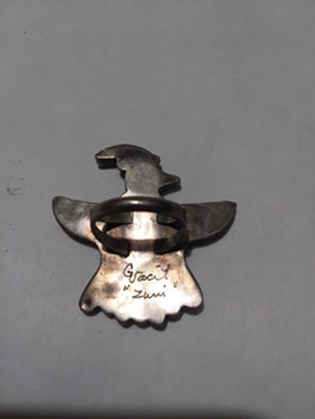 Late 1900s, Beautiful Zuni sterling thunderbird ring with turquoise, jet, coral, and shell stone-to stone inlay; hallmarked "G. Vacit." Size 8-1/2