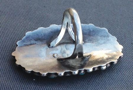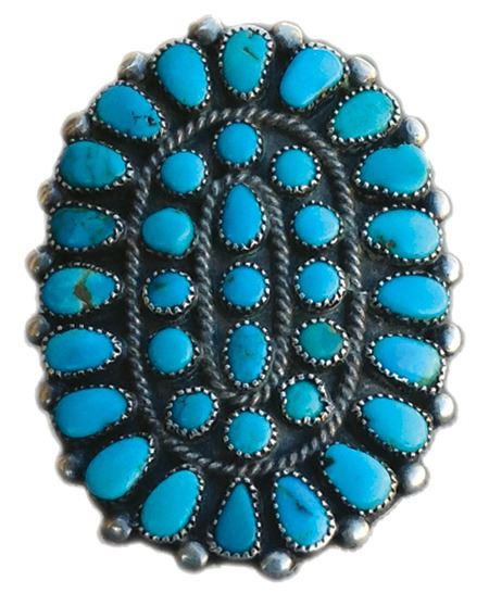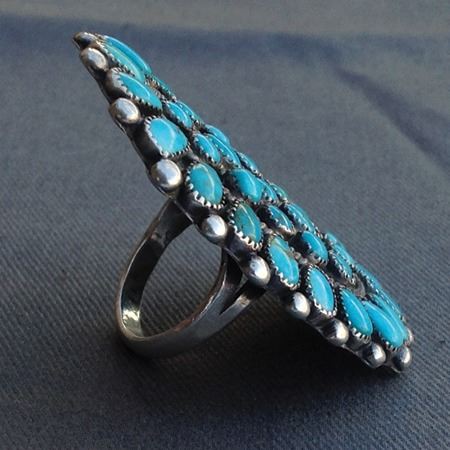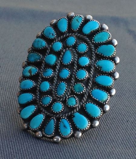 Ca. 1970s, Silver and turquoise Zuni cluster ring. Very good condition. Size 8, top 1-3/4" x 1-1/2"