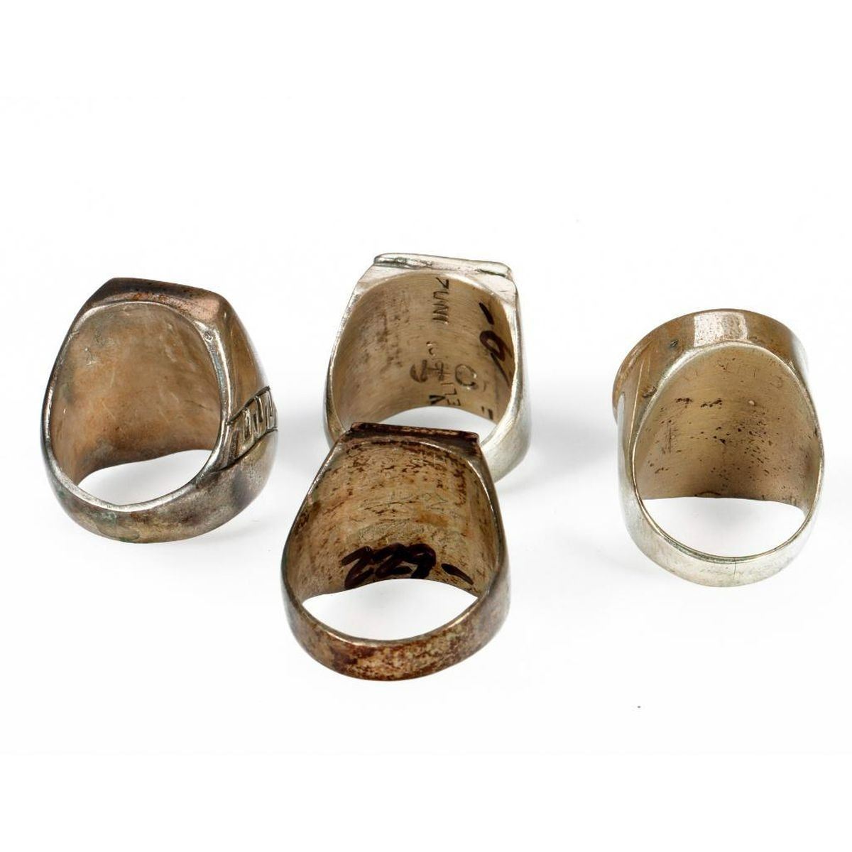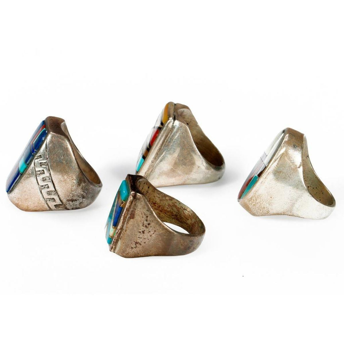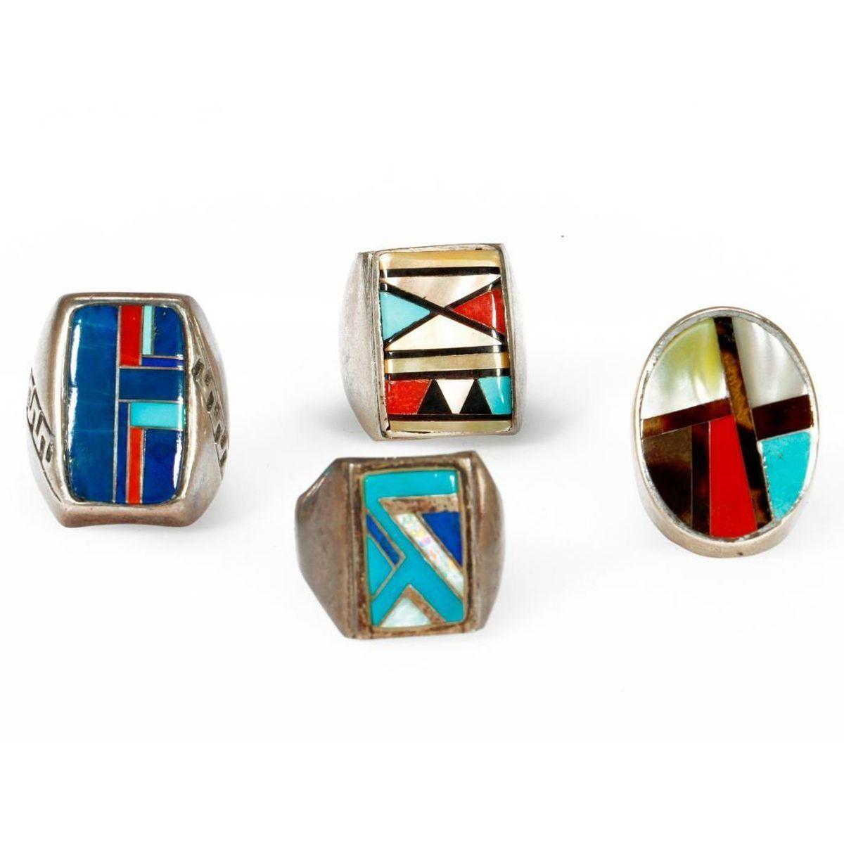 Old Pawn Southwest jewelry, consisting of a miscellaneous grouping of 4 silver, hard stone and turquoise rings. Approximate size: 1 inches in length largest example. Rings sizes range from approximately: 8, 8 1/2, 9 1/2, 11 1/2. Approximate total weight: 92 g.