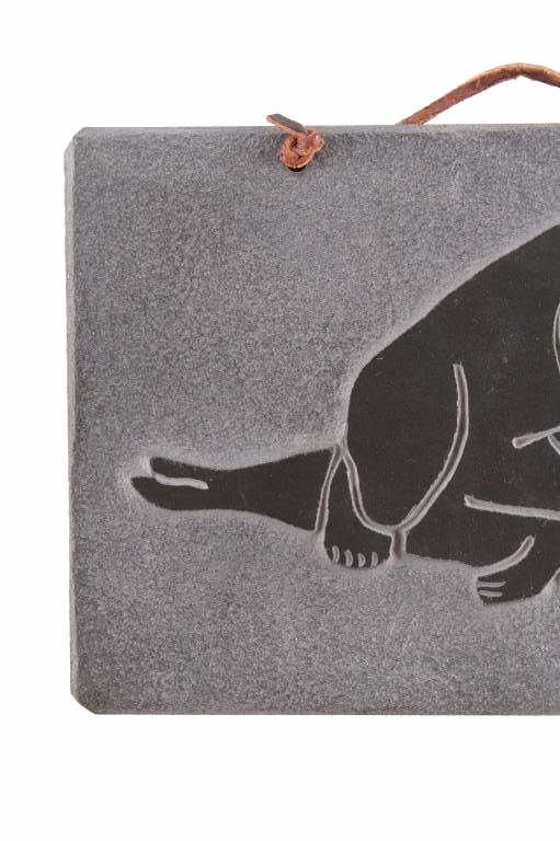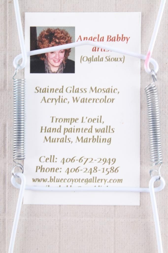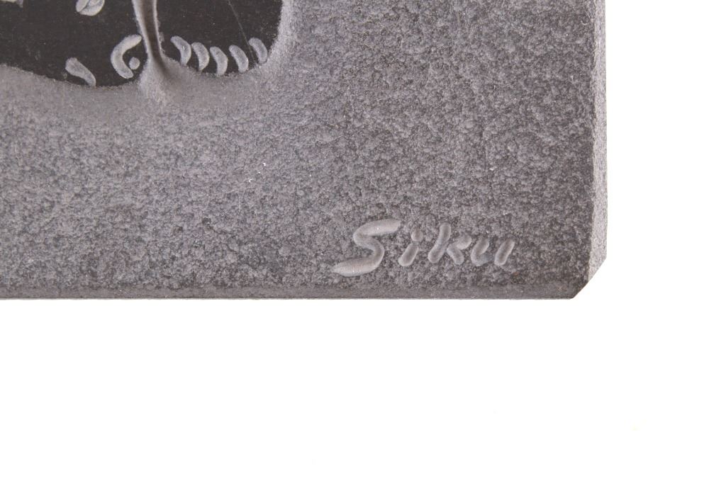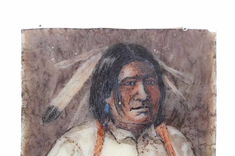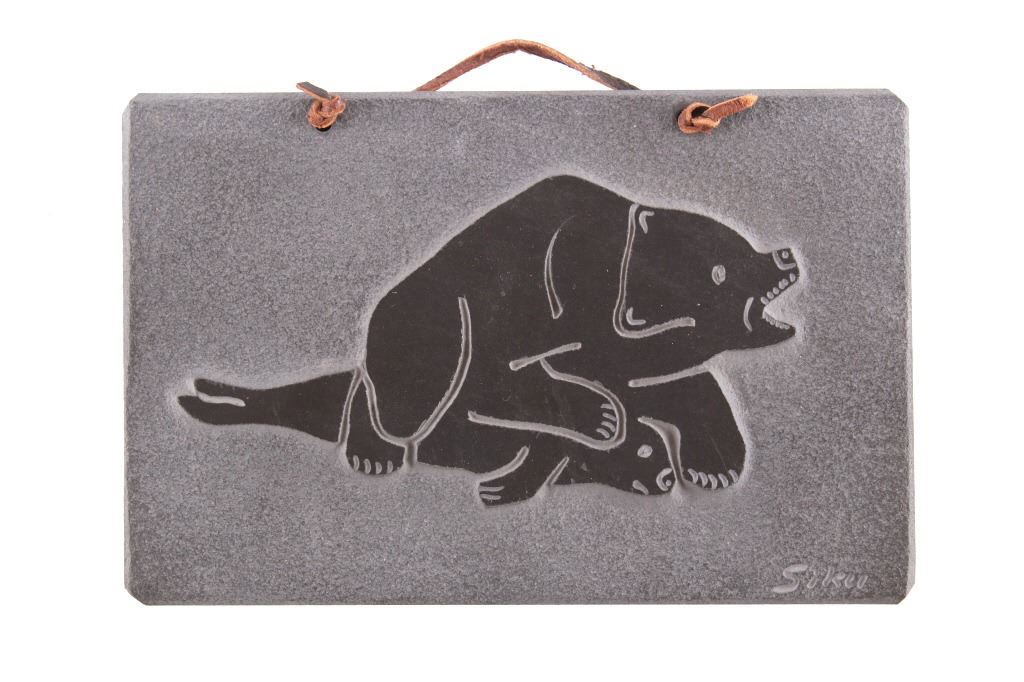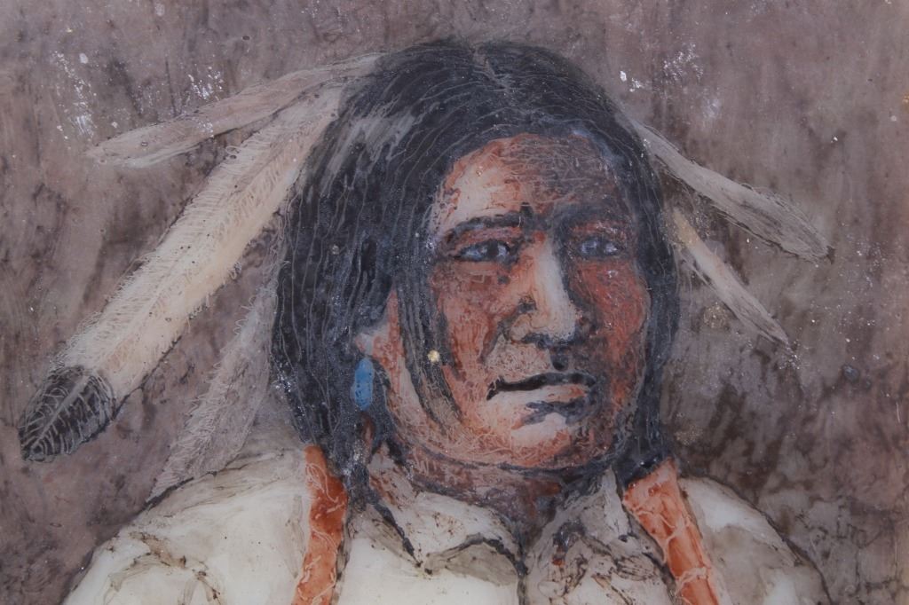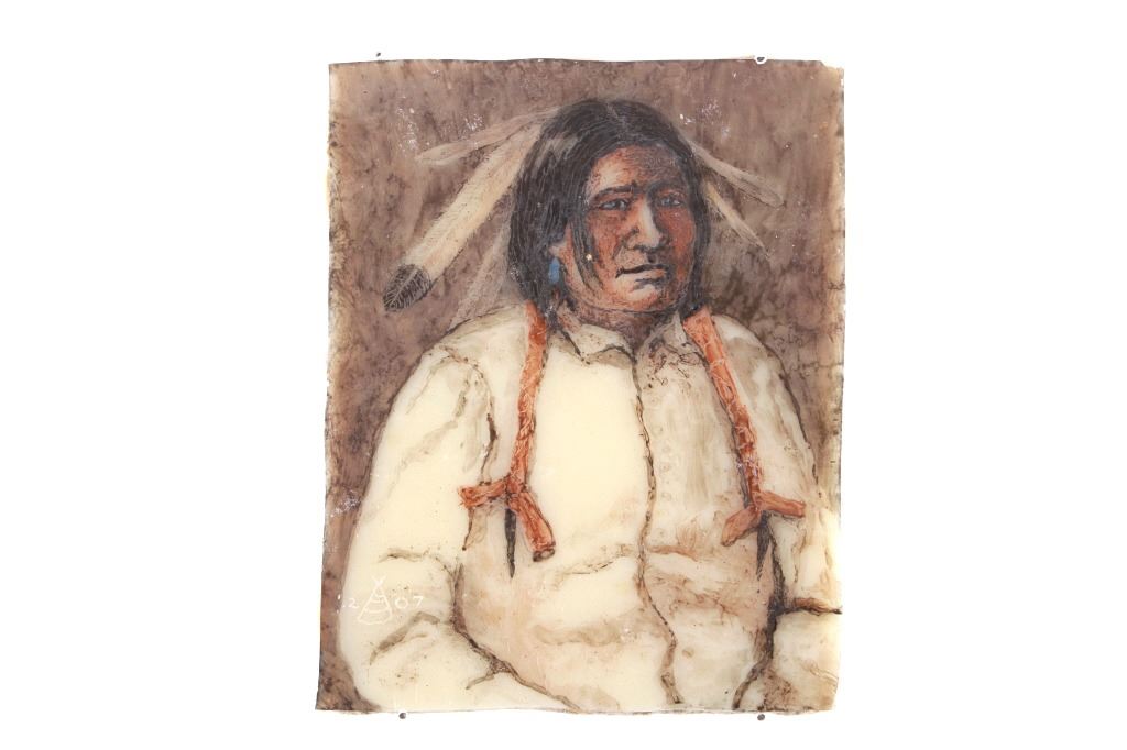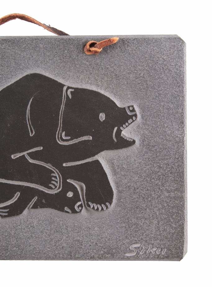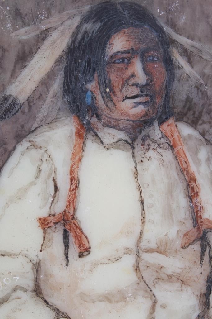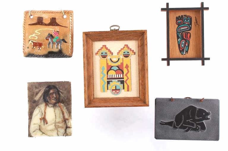 2) a stained glass mosaic of a Native American male elder by Oglala Sioux artist Angela Babby, 5"H x 4"W x .5"D; 3) an Inuit Siku wall hanging soapstone carving of a "growling bear defending a seal kill", Siku is carved on the lower right corner of the face, 6"H x 4"W;