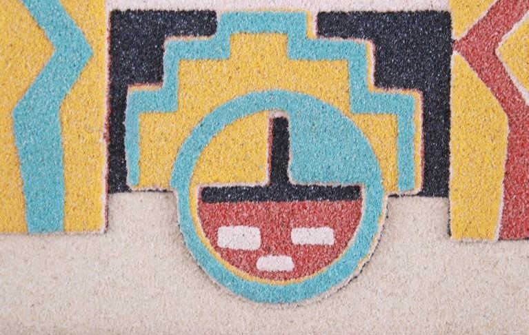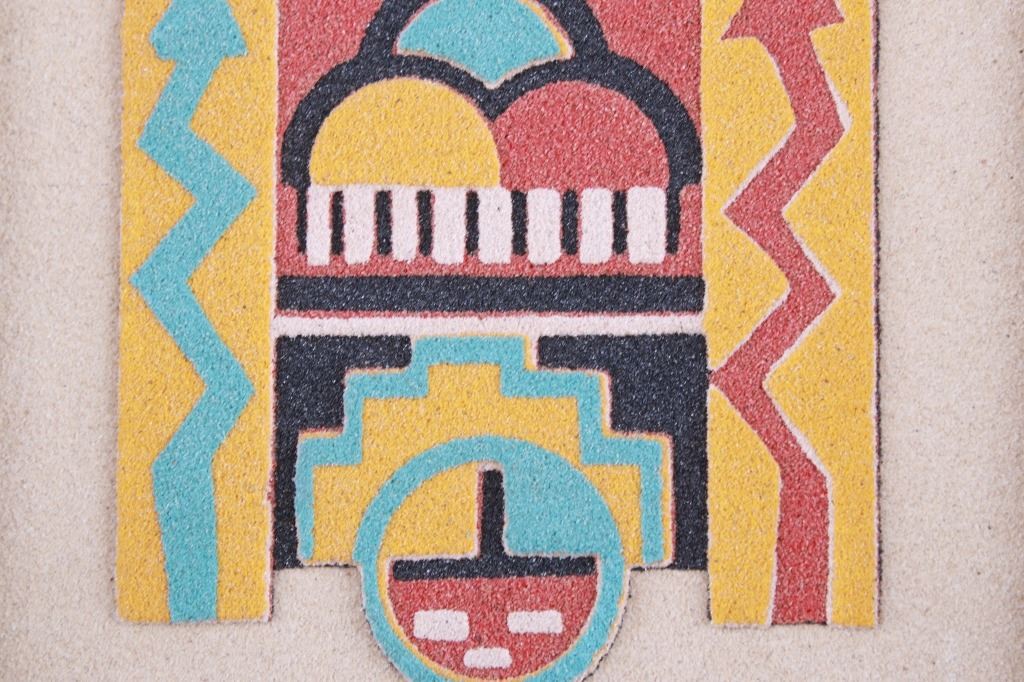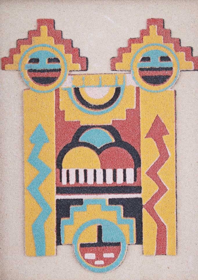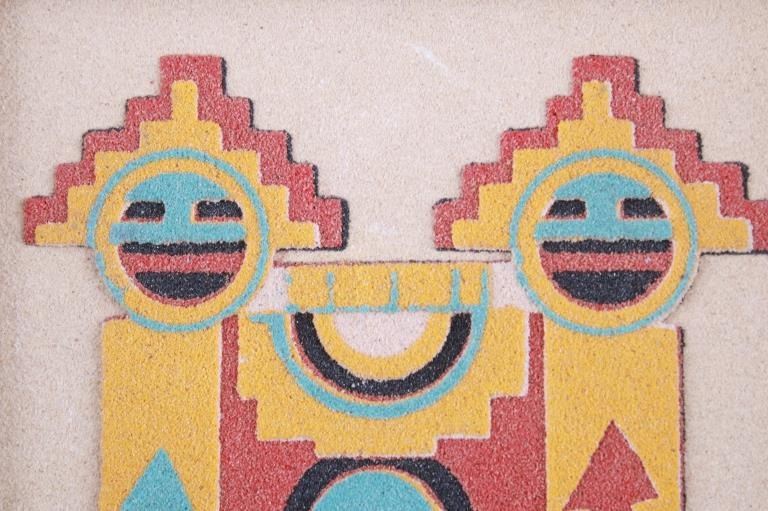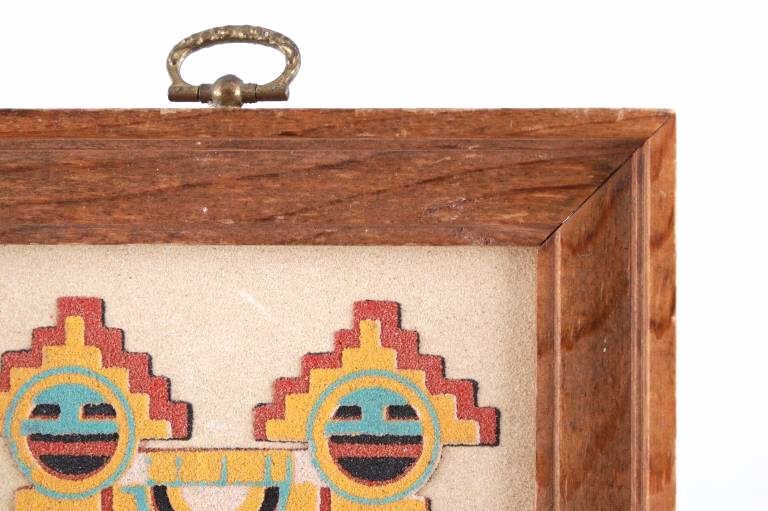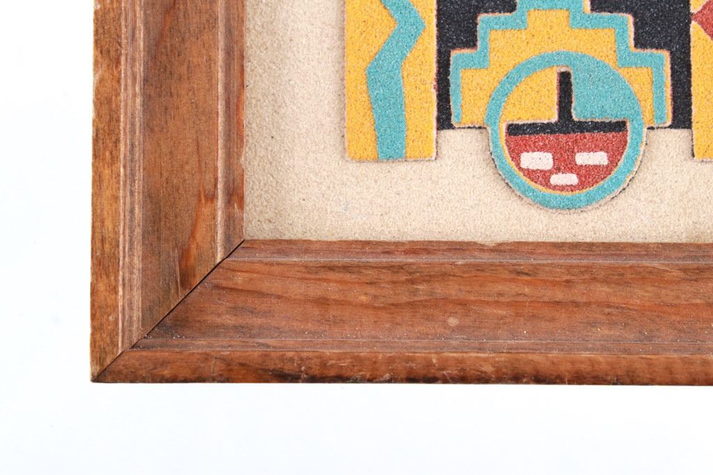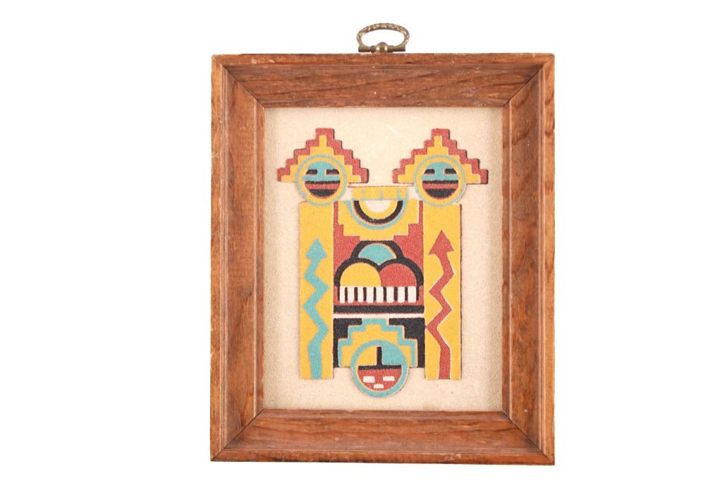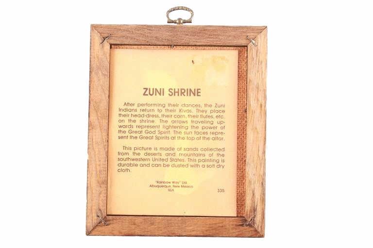 Included in this lot is a collection of five Native American art mediums:1) a shadowbox wood framed Zuni sand art named, "Zuni Shrine", a wall hanging made from sands collected from the deserts and mountains of the southwestern US, 7"H x 6"W x 1"D, artist unknown;